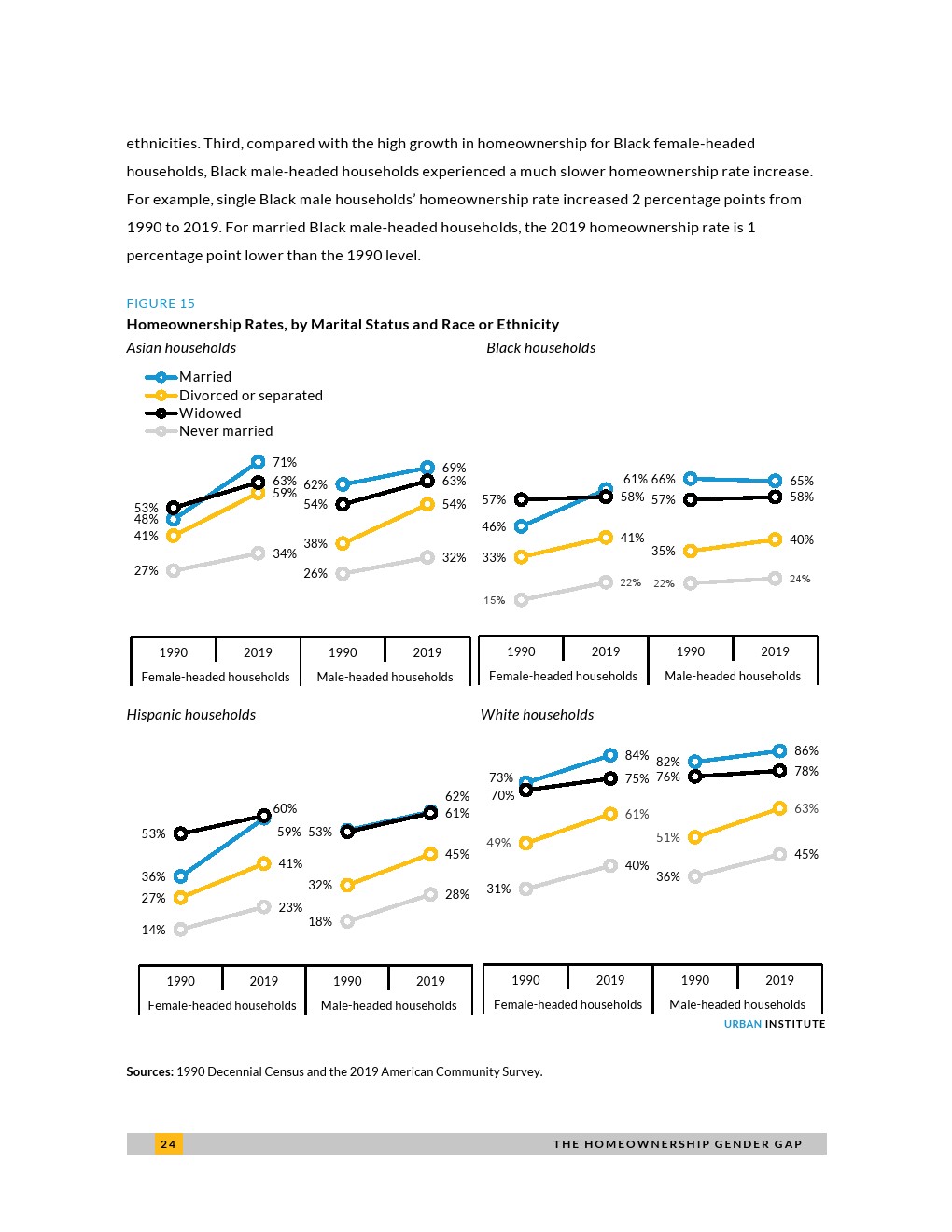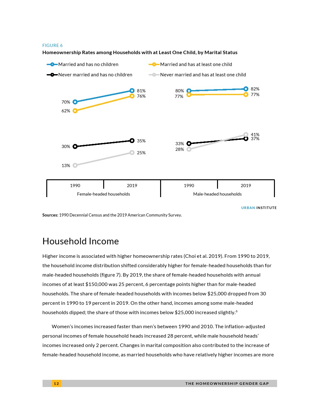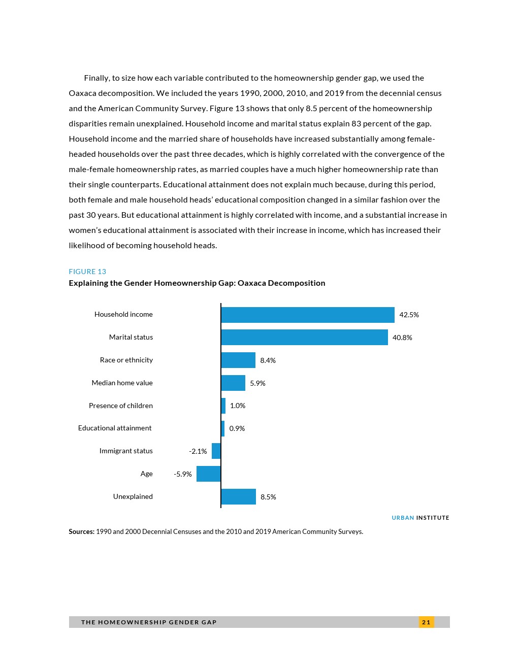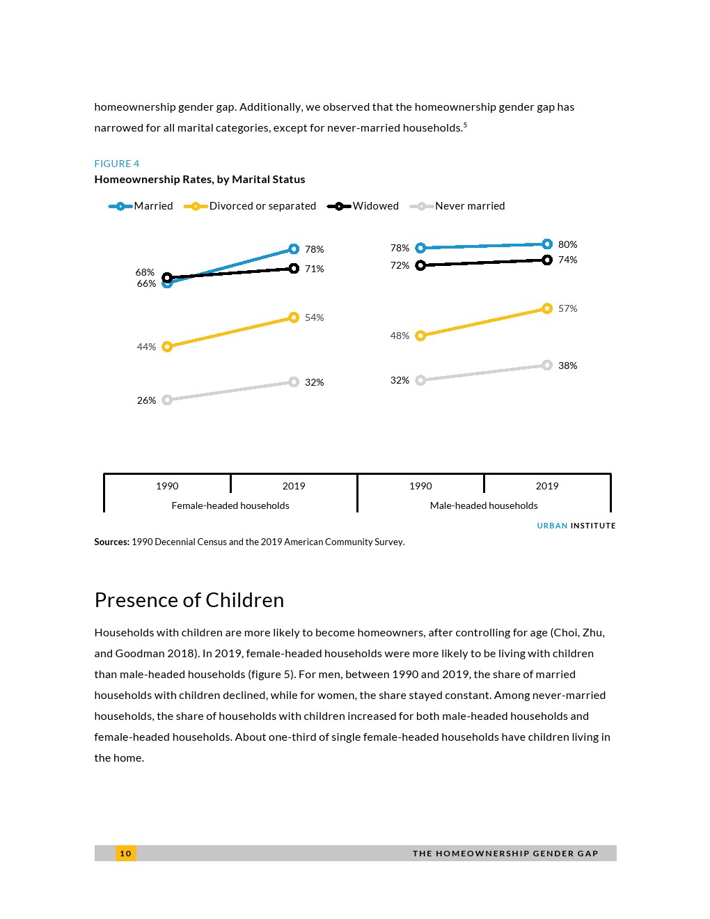 这份报告通过户主的性别调查了房屋所有权情况,以及在过去三十年它是如何变化的。分析探讨了缩小住房所有权性别差距的因素,包括总体以及种族和民族。这种缩小主要归因于家庭收入的增加,其次是更多的已婚妇女成为户主。