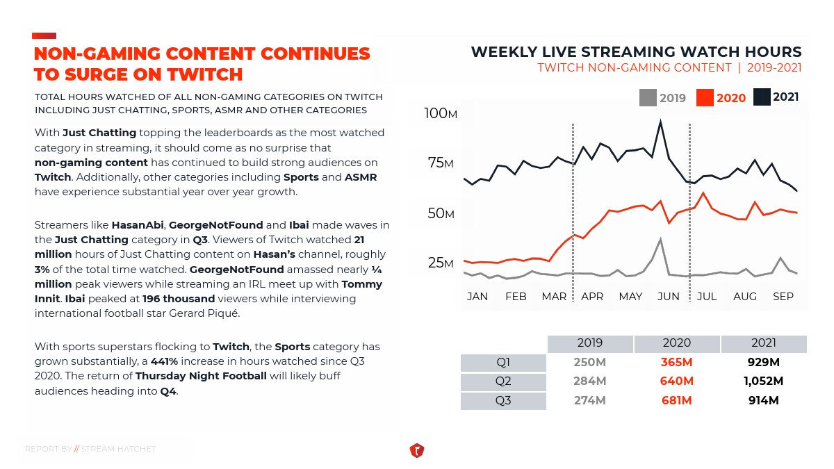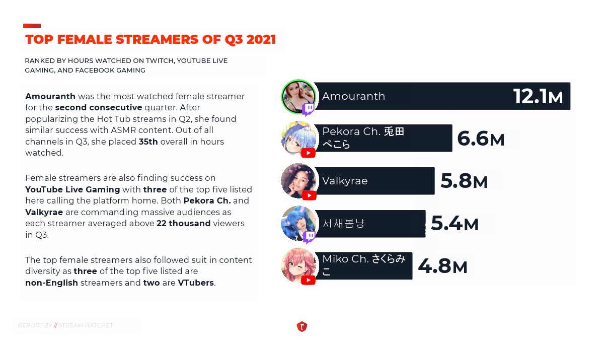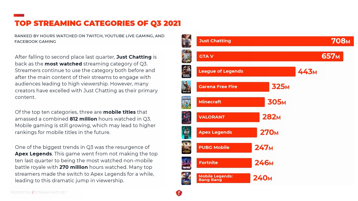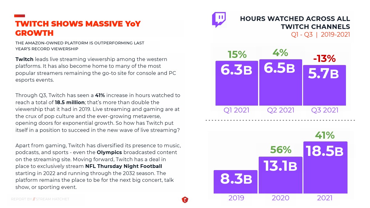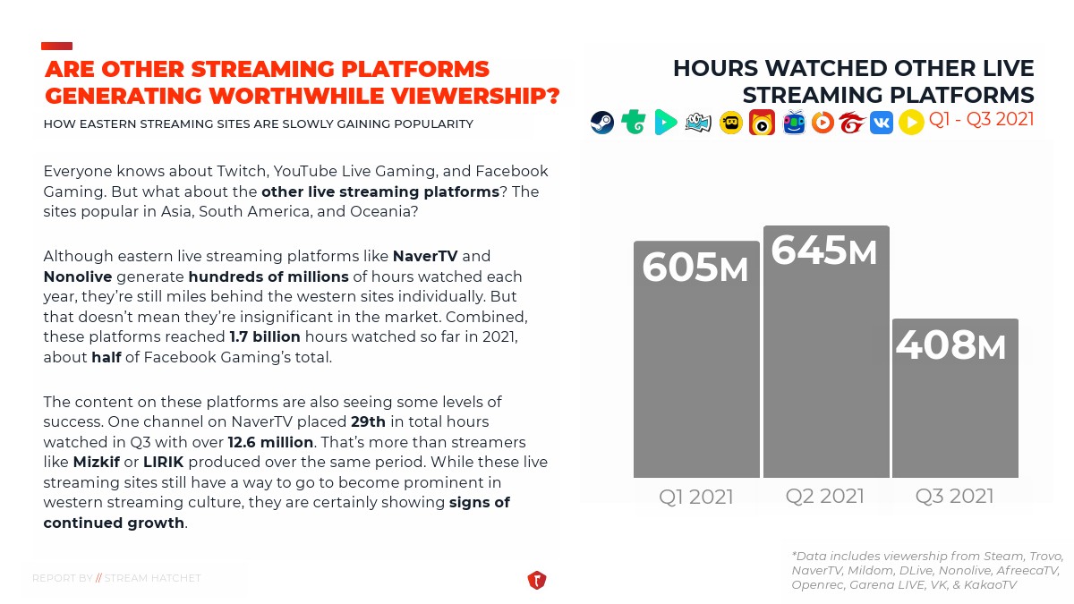 STREAM HATCHET发布了“2021年第三季度直播报告”。Twitch在西方平台的流媒体直播观众中居于领先地位。它还成为许多最受欢迎的直播博主的“聚集地”,并且是游戏机和PC电子竞技活动的首选站点。