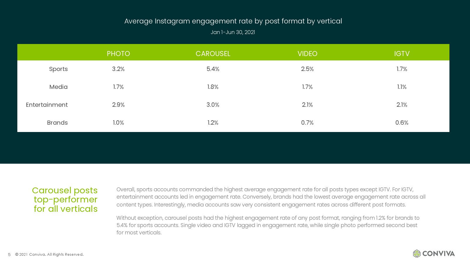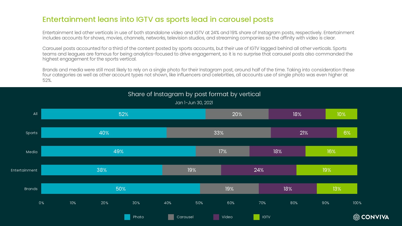 从平台的基本情况来看,在体育、媒体、娱乐和品牌账户中,独立照片仍然是Instagram上最受欢迎的帖子类型,占2021年上半年平台上所有帖子的一半以上(52%)。尽管这一比例低于2019年同期的56%,但照片在Instagram上仍占据主导地位。