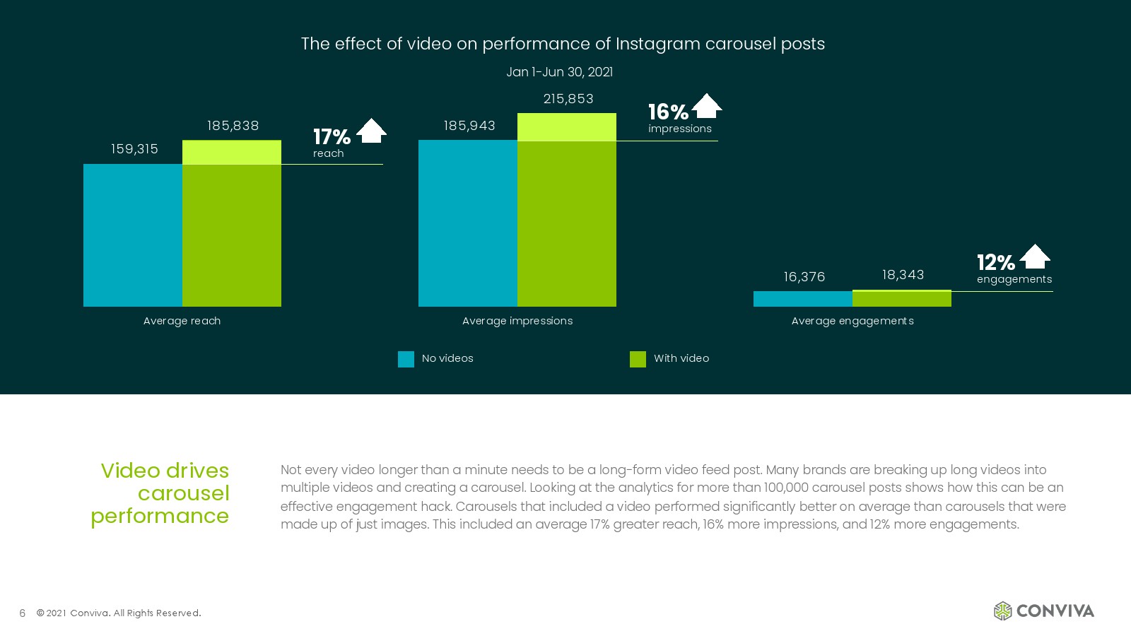 另一方面,视频已经失去了作为第二流行帖子类型的地位。尽管2019年上半年,独立视频帖子占近29%,但在2021年上半年,独立视频帖子仅占所有帖子的18%。