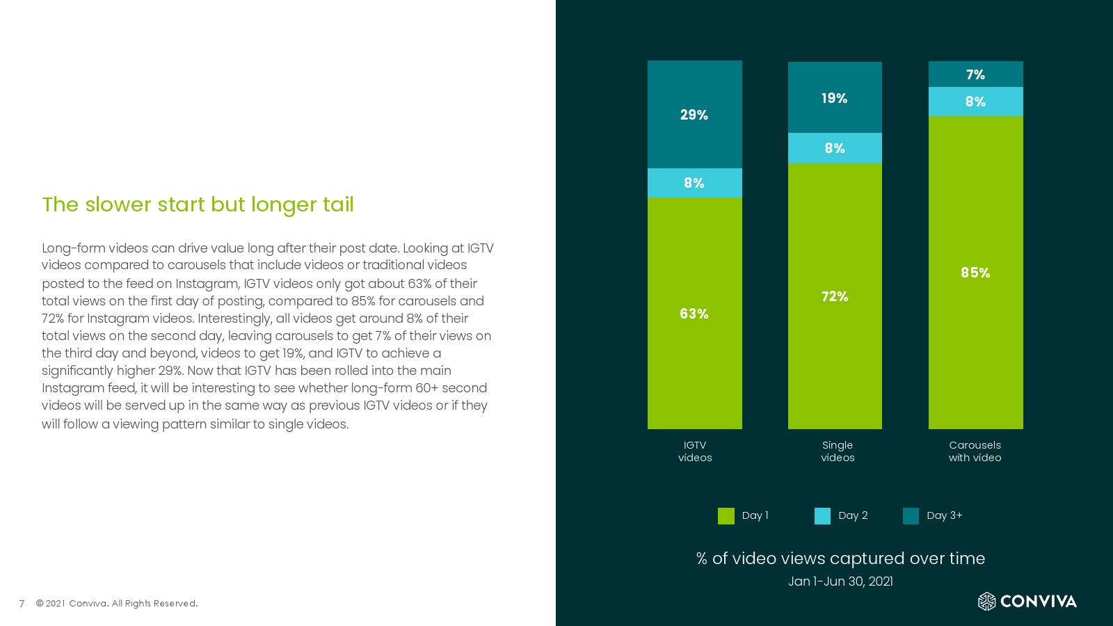 此外,carousel帖子在发布的第一天就能获得最大份额的浏览量,在第一天收到了85%的浏览量。虽然IGTV视频(63%)和单个视频(72%)在发布后的第一天内也获得了大部分的总浏览量,但它们的保存期似乎更长,29%的IGTV视频和19%的单个视频在发布后3天或更长时间内仍被浏览。
