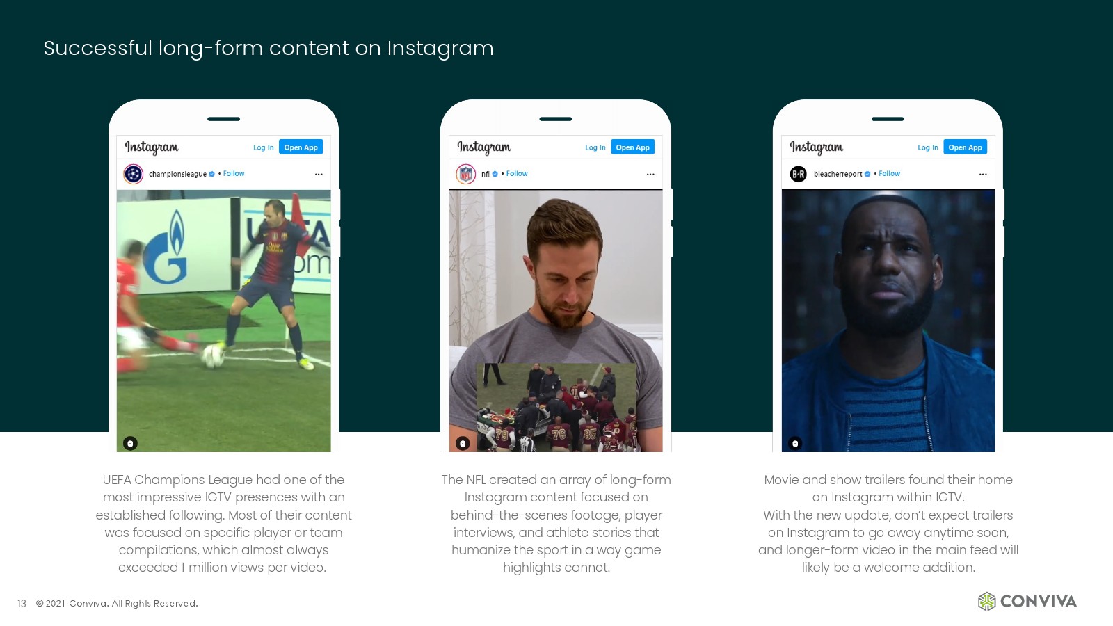 Instagram是第二大最受欢迎的企业社交媒体平台,7/10的受访者表示该平台对企业的发展至关重要。尽管3/4的营销人员计划增加Instagram视频的使用量,但Conviva的最新报告显示,新功能的使用正在超越独立的视频帖子。