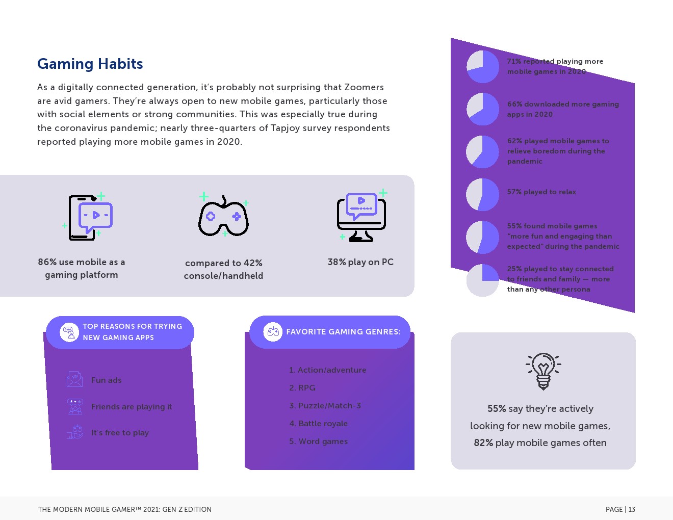 71%的Z世代表示,2020年他们花更多的时间玩手机游戏,55%的Z世代认为手机游戏“比预期的更有趣、更吸引人”。超过1/3的Z世代在新冠大流行期间花更多时间购物,尤其是购买家用物品和餐盒。
