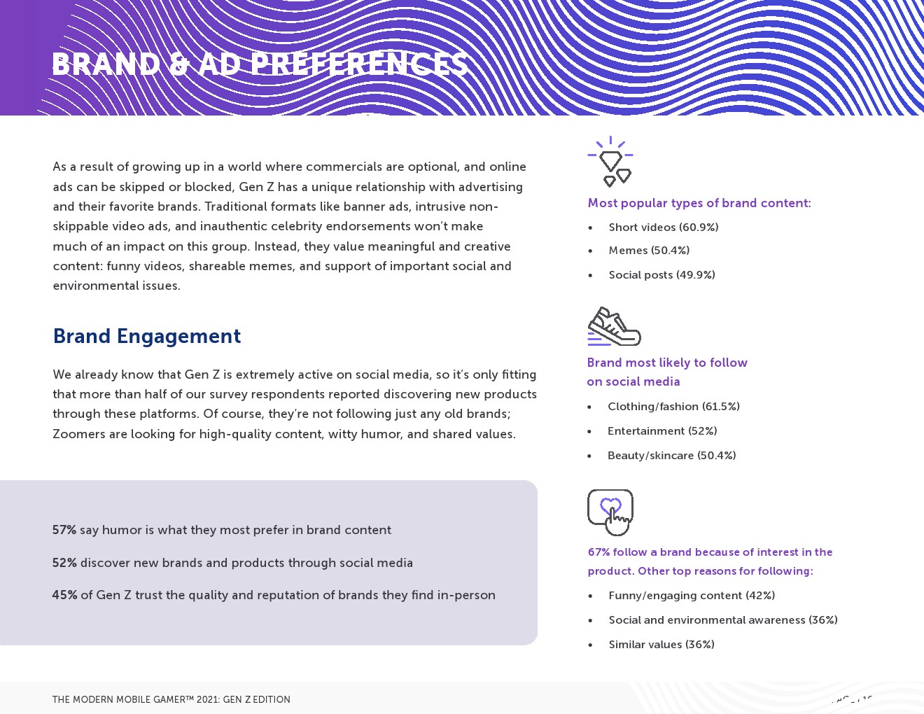 他们不喜欢侵入性广告和不真实的品牌,但他们重视有意义和创造性的内容,如有趣的视频、可共享以及对重要社会和环境问题的支持。