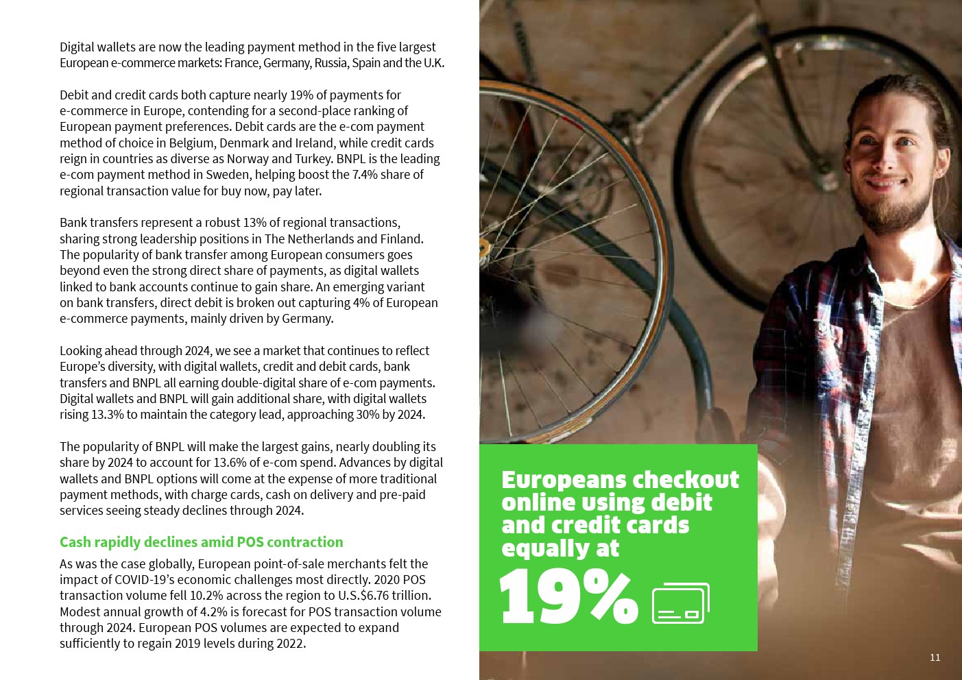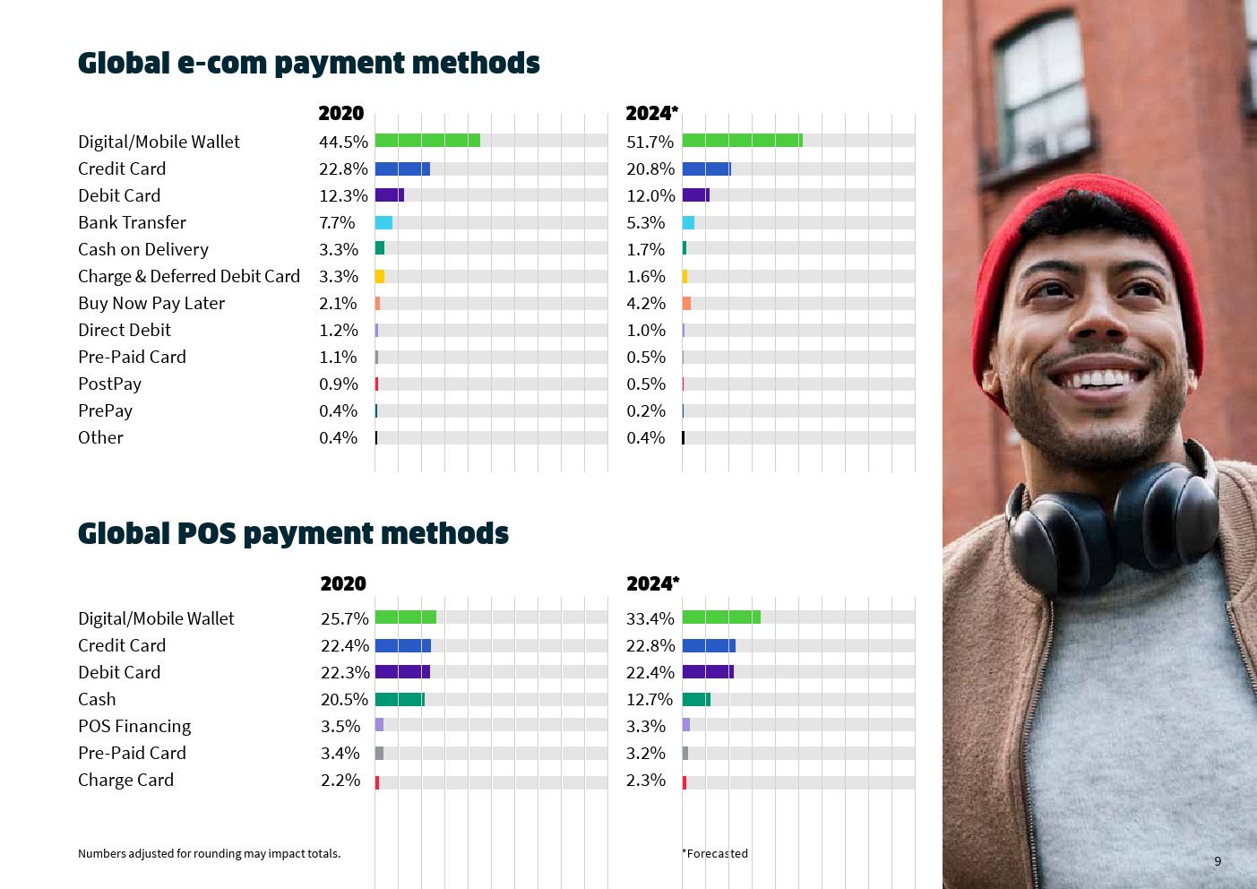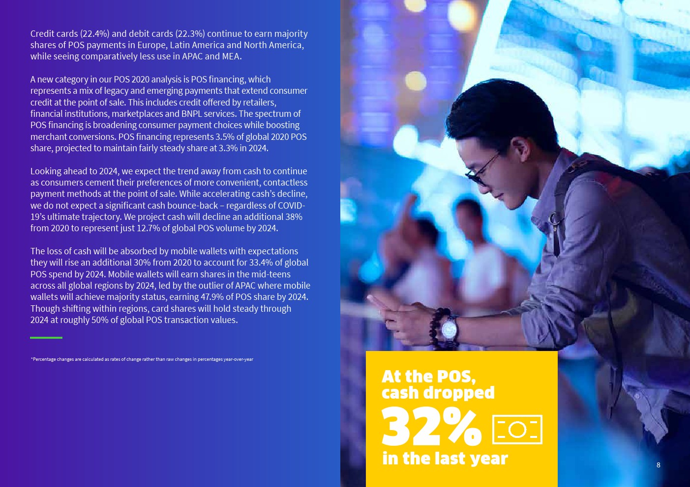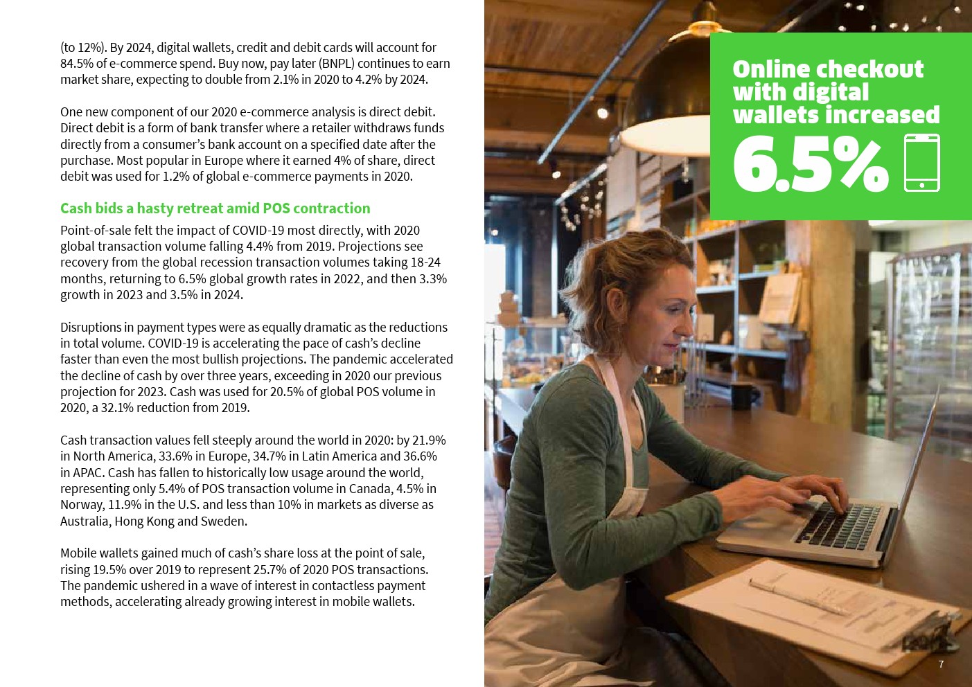移动钱包填补了现金的空缺,比2019年增长19.5%,占2020年销售点交易的25.7%。