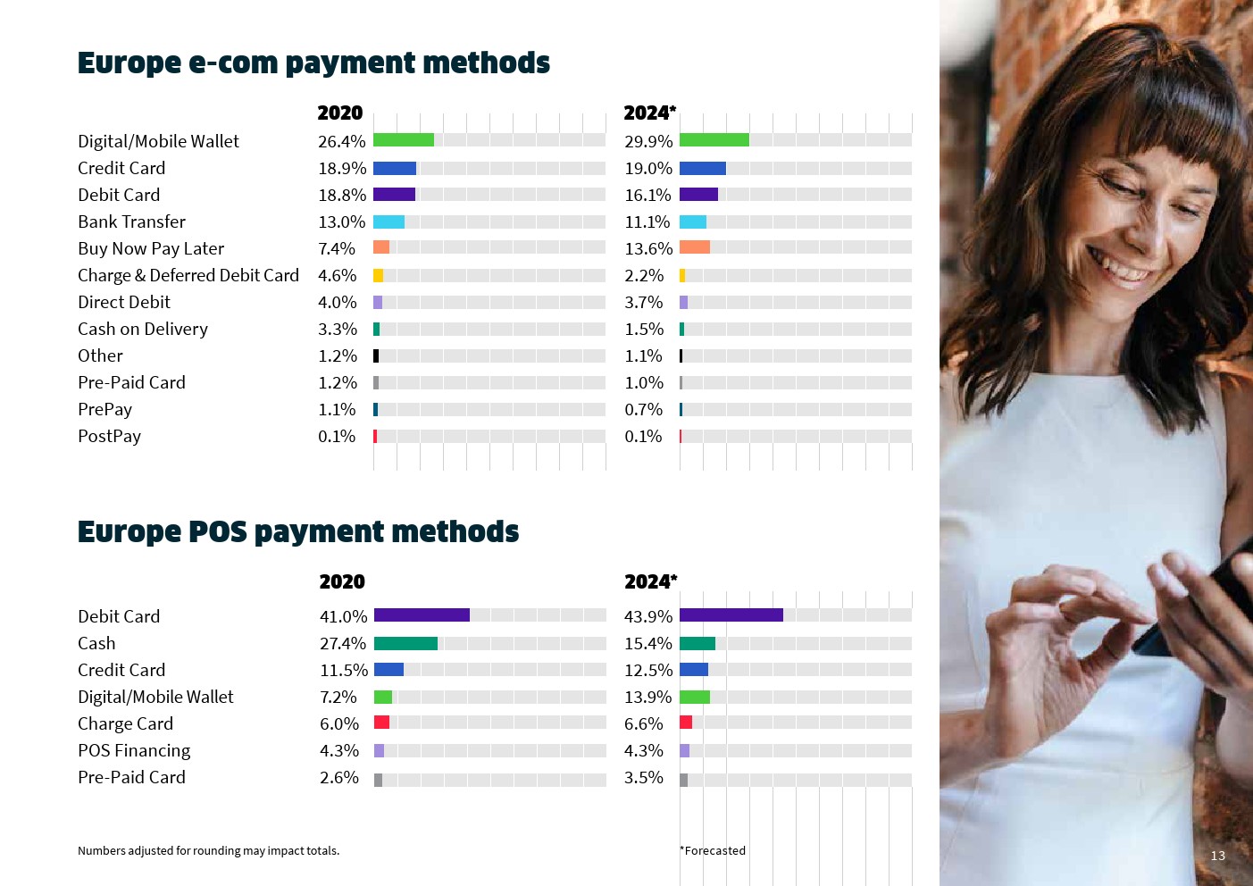 在欧洲、拉丁美洲和北美,信用卡(22.4%)和借记卡(22.3%)占销售点支付的大部分,而在亚太地区和中东和非洲的使用相对较少。