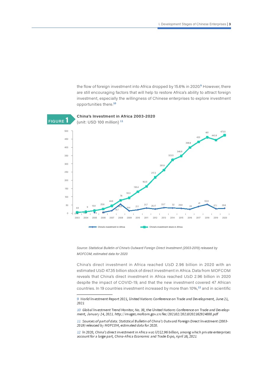 根据中国商务部(MOFCOM)的数据,截至2020年底中国对非洲的直接投资存量为473.5亿美元。2019年,商务部指出中国私营企业占中国企业在非洲投资的70%左右。2021年中非商业委员会(CABC)对近100家主要私营公司的调查发现,非洲的“再投资”比例约为30%。鉴于许多公司尚未在商务部系统中“注册”,且统计数据中未包括“再投资”,本报告估计,到2020年底中国企业在非洲的投资存量不低于560亿美元。