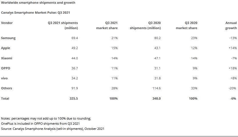 全球芯片组短缺导致智能手机出货量在2021年第三季度下降6%。三星再次成为领先供应商,出货量6940万台,占21%的市场份额。随着iPhone13的发布,Apple 排名第二,出货量4920万部,增长14%。小米排在第三位,出货量4400万台,达到14%的市场份额,OPPO和vivo分别排在第四和第五位,出货量分别为3670万台和3420万台。