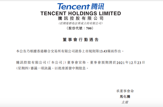 新浪科技讯 12月13日晚间消息,腾讯控股今日晚间在港交所发布公告称,董事会预期将于2021年12月23日(星期四)审议一项决议,以批准派发中期股息。