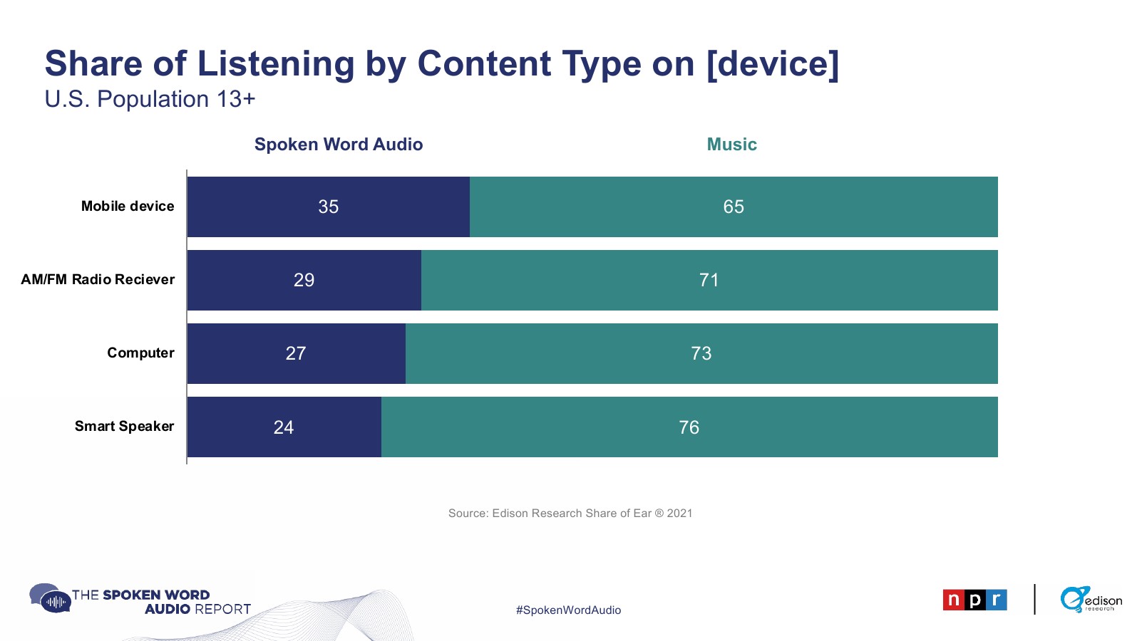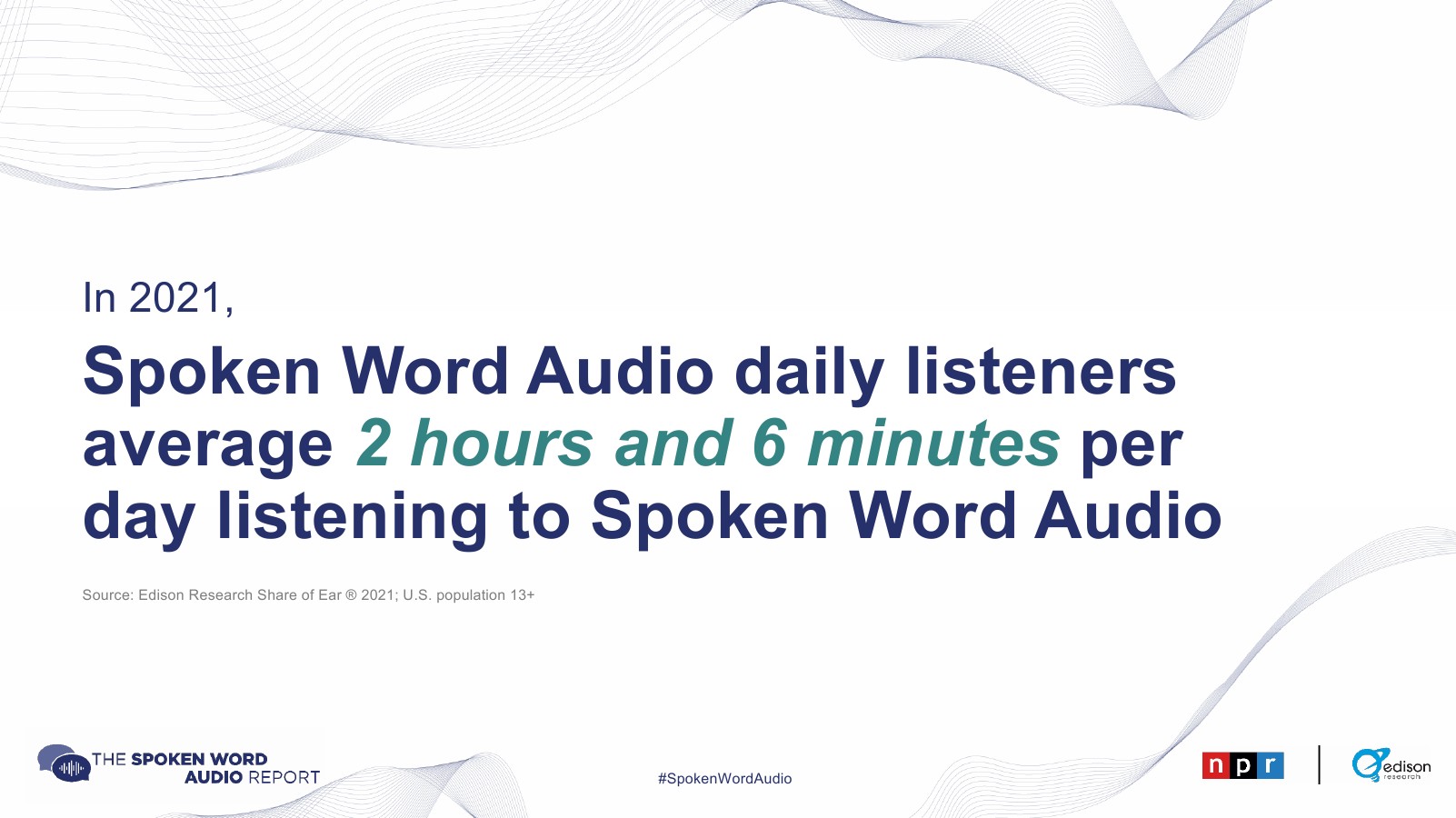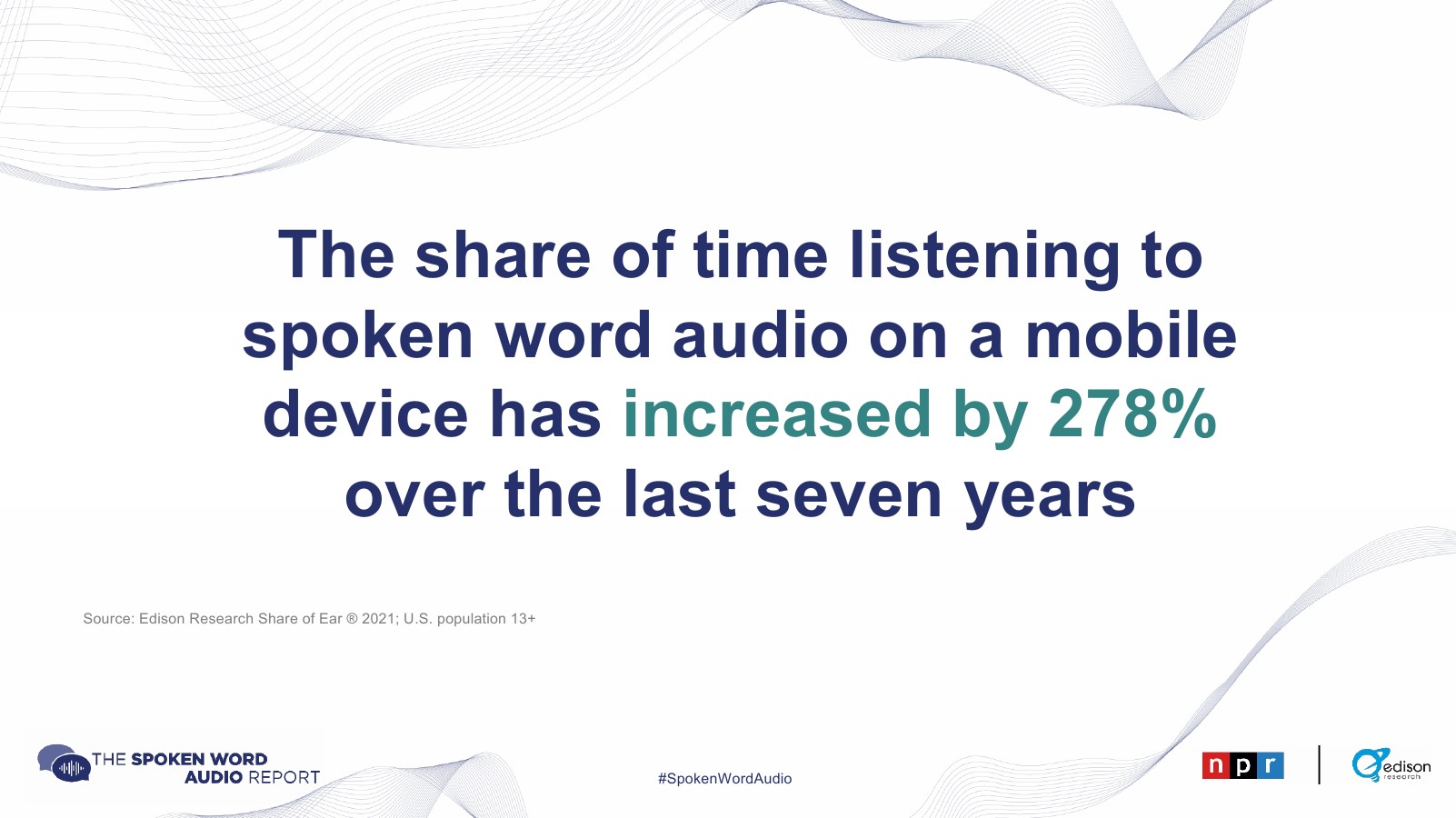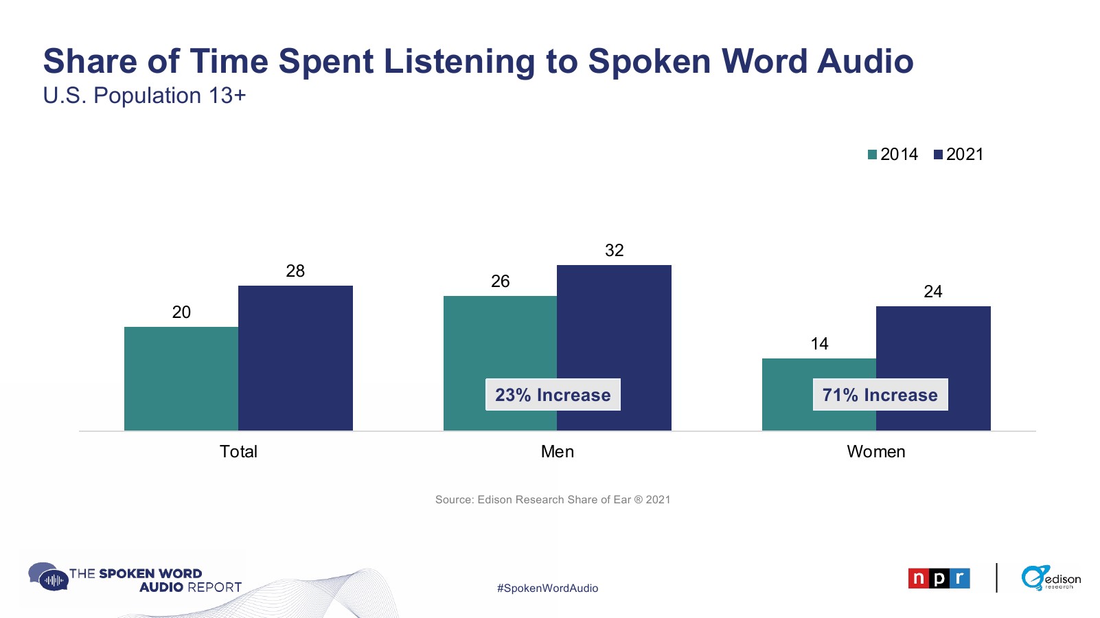 在过去八年,口语音频,即新闻、体育、谈话/个性和有声读物,在听力中所占的份额有所增加。2014年,口语音频占音频收听时间的20%,音乐占80%。但是,2021年口语音频的份额增长到28%,比2014增长了40%。