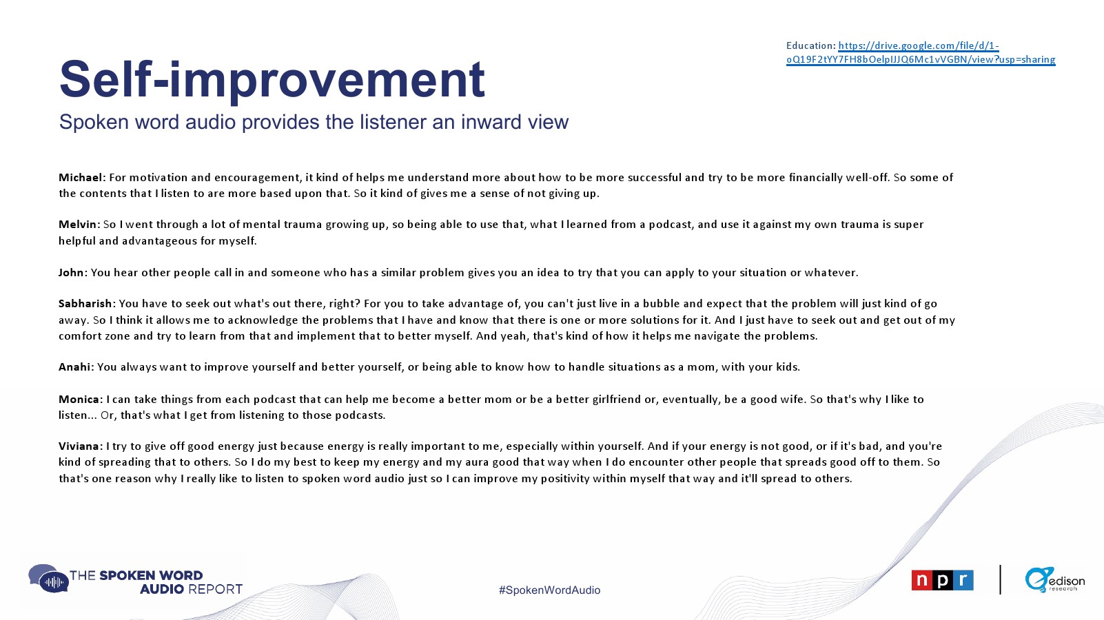 最后,每月听口语音频的受访者往往主要通过在线搜索(59%)、从家人和朋友那里获得推荐(51%)和社交媒体(44%)来发现新节目。