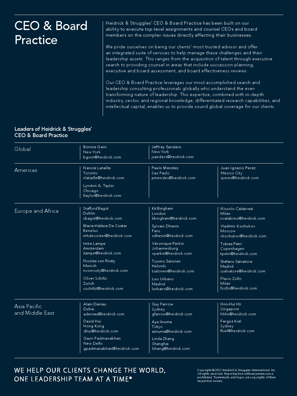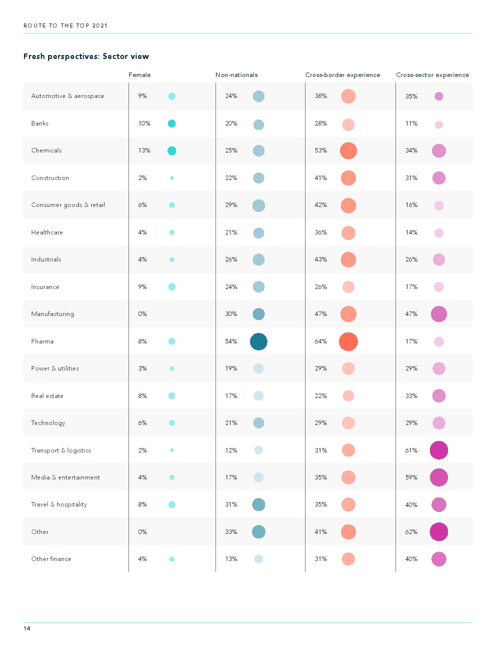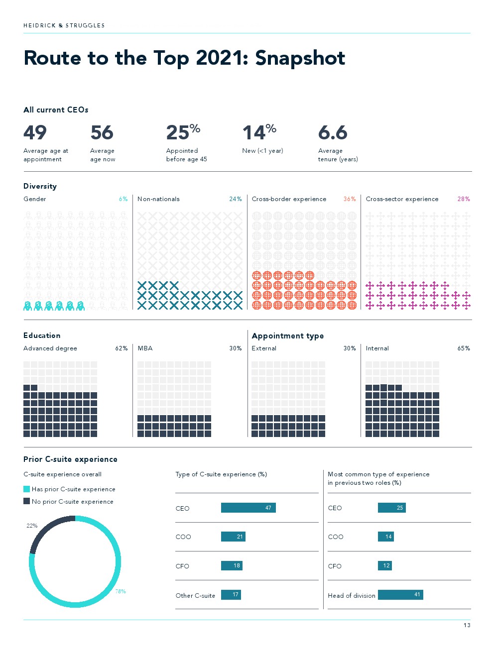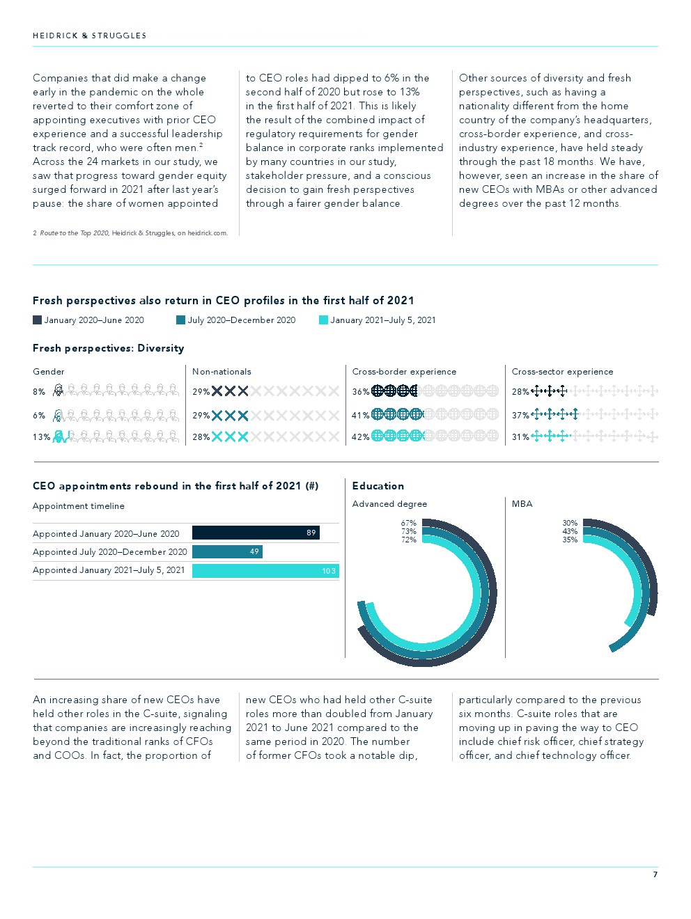 2021年上半年的CEO任命数量创历史新高,为2018年以来的最高水平。同期任命的女性CEO比例翻了一番:2021年上半年任命的所有CEO中有13%是女性,而前六个月为6%,尽管绝对数字仍然很低。更多的新任 CEO 拥有超越传统 CFO 和 COO 角色的C-suite级经验,包括首席风险官、首席战略官和首席技术官等角色。在去年年初外部任命兴起了一段时间后再次转向了内部任命。与直接前任相比,新任CEO更有可能是女性、来自公司总部以外的国家、拥有跨国经验和高等学位。调查结果表明,公司正在回归更广泛的CEO继任观点。内部任命的CEO人数稳步增加,同时确保这些CEO拥有各种新观点,也凸显出许多公司正在加强其继任渠道,以便他们可以在组织内担任更多的领导角色。