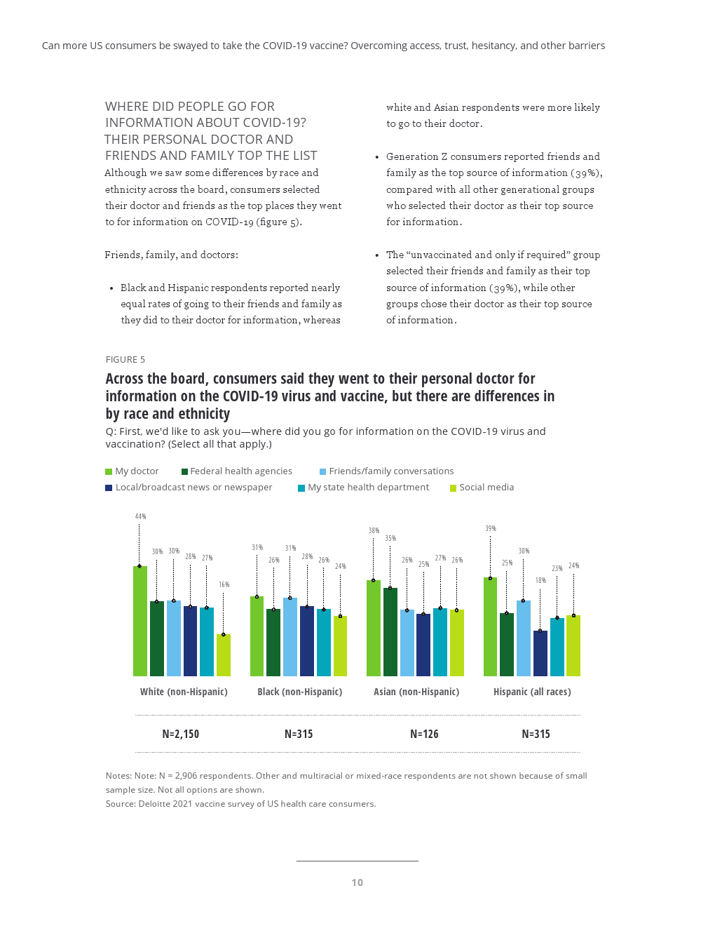 –去哪里获取信息:未接种疫苗的受访者更可能从朋友/家人那里获取信息而不是他们的医生。医生的信息是所有其他群体最常用的来源。