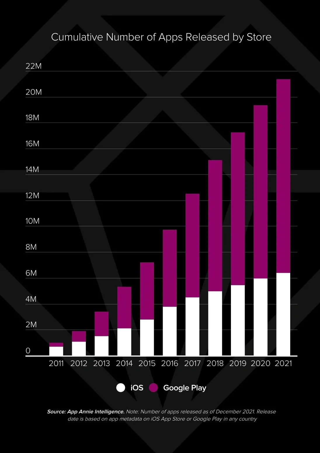 2021年,新的移动应用发布也有所增长,出版商推出了200万个新的应用和游戏,使整个App Store和Google Play有史以来发布的应用和游戏总数达到2100多万。当然,老的应用程序和游戏后来在这些年里被出版商自己或应用商店在清理时删除。目前,应用商店中有540万个”实时”应用和游戏,其中180万个在iOS,360万个在Google Play。