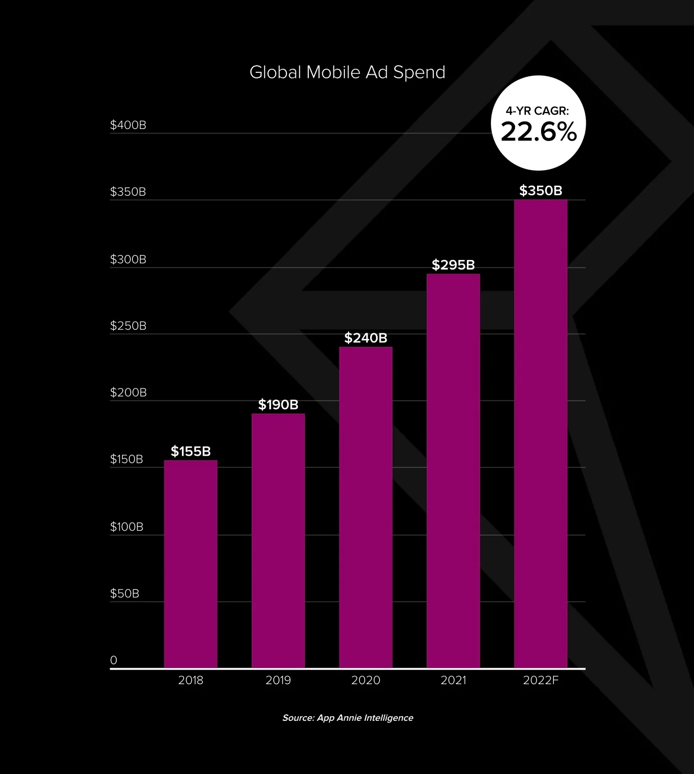 在包括付费应用、订阅和应用内购买的消费者支出之外,尽管营销人员对苹果的隐私变化和IDFA的打击感到担忧,但更广泛的移动应用市场在2021年达到了2950亿美元,同比增长23%。2022年,在北京奥运会和美国中期选举等大事件的帮助下,该市场预计将增长到3500亿美元。