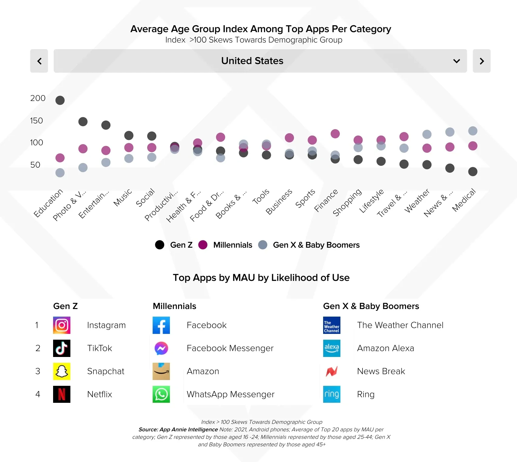 在美国,Z 世代最常使用的应用程序包括 Instagram、TikTok、Snapchat 和 Netflix。同时,千禧一代更喜欢 Facebook、Messenger、亚马逊和 WhatsApp。X 一代,现在已经被归入婴儿潮时期的人口中,使用天气频道、亚马逊Alexa、NewsBreak和Ring。