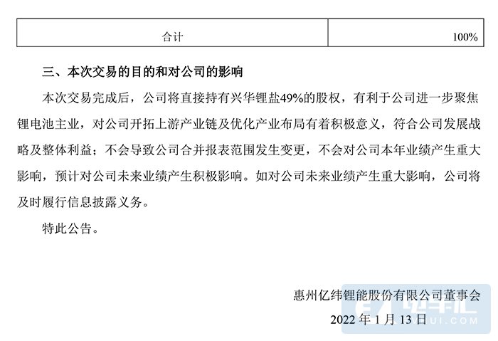 亿纬锂能表示,上述交易完成后,公司将直接持有兴华锂盐49%的股权,有利于公司进一步聚焦锂电池主业,对公司开拓上游产业链及优化产业布局有着积极意义,符合公司发展战略及整体利益。