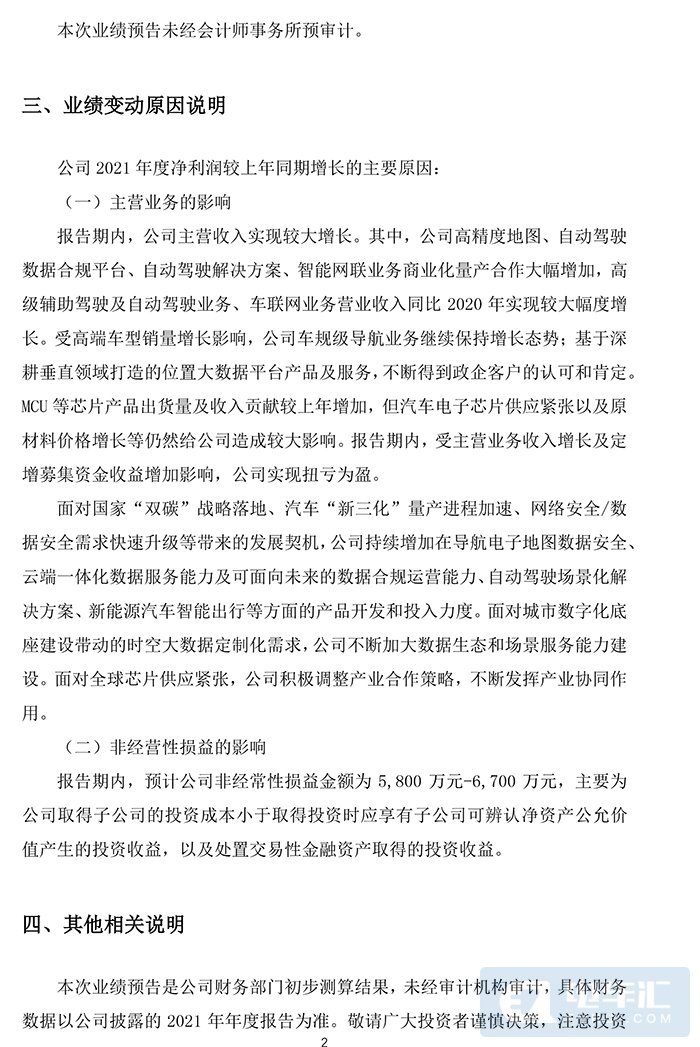 原标题:四维图新预计2021年净利润达1.01亿元至1.31亿元