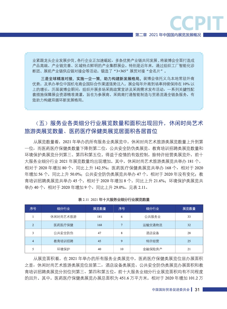 广东办展数量最多,上海办展面积最大。上海、北京和广州继续领跑全国展览业发展,深圳、青岛、成都、郑州和武汉等城市展览业发展优势进一步显现。从行业分布看,展览数量从多到少依次是轻工业展览、重工业展览、服务业展览和农业展览,占比分别为41.5%、24.7%、23.3%和6.3%,轻工业展览在办展数量和办展面积上均居各行业之首。