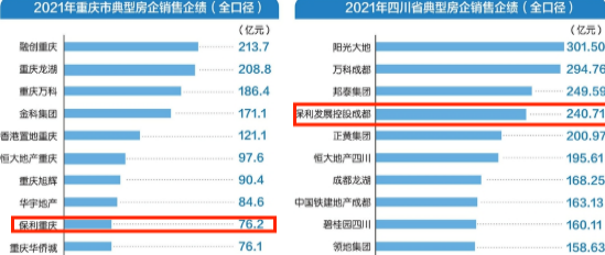 据公开数据显示,融创与龙湖盘踞2021年重庆房企销售排行榜的前两位,四川地区则由阳光大地和万科领衔;徐鲁分管的保利川渝地区,虽然仅以76.2亿元的业绩位列重庆前十,但是四川市场似乎仍有很大的开发潜力。