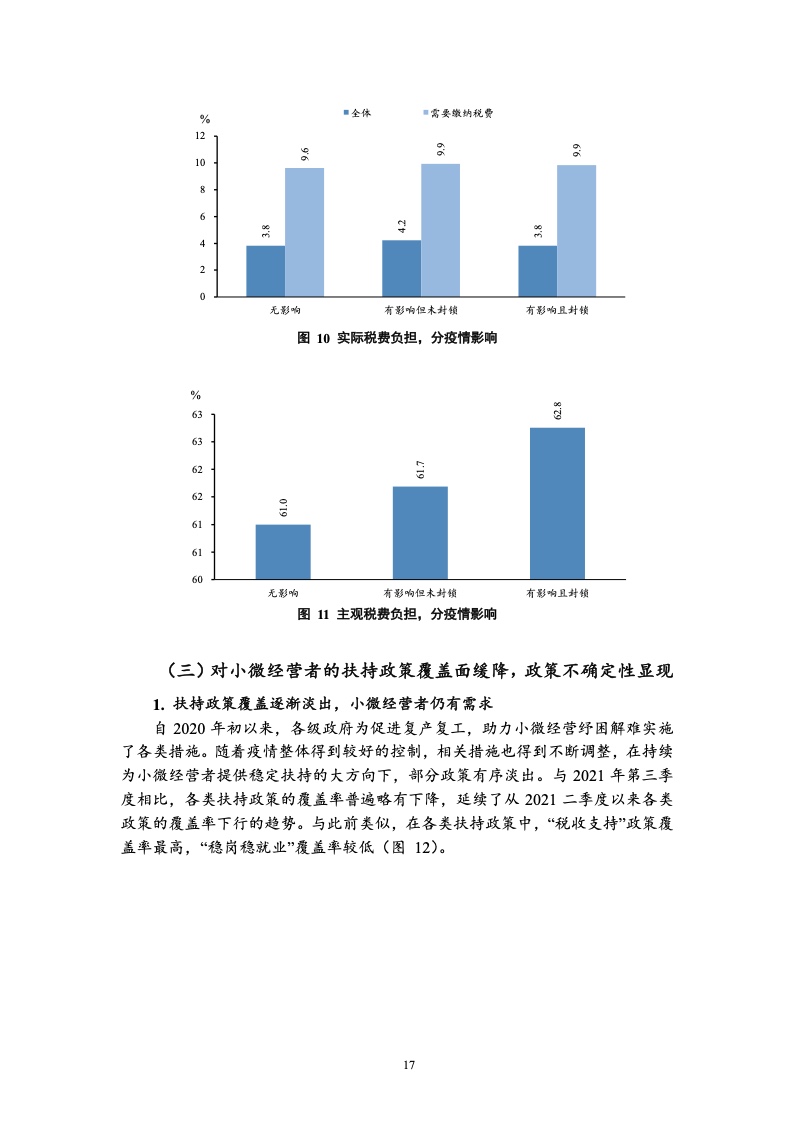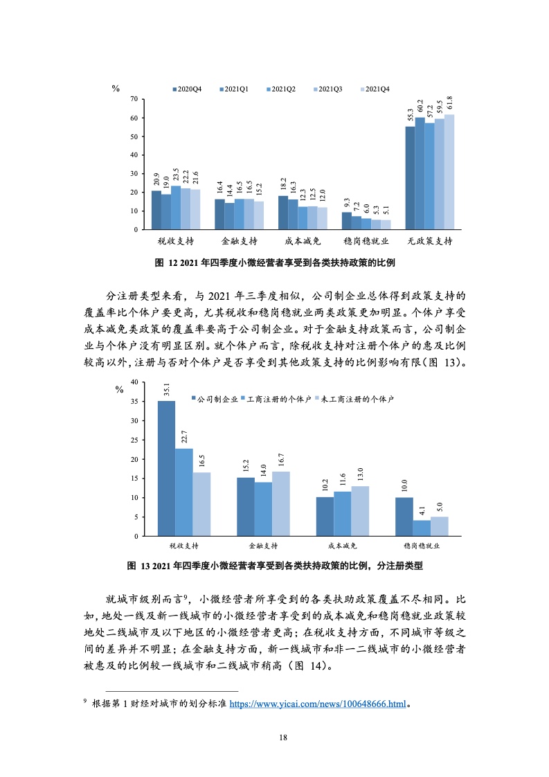 扶持政策逐步退出,覆盖比例与上季度相比小幅下降,普惠性的税收支持政策覆盖比例较其他政策更高。 各项扶持政策对小微经营者的覆盖程度在不同注册类型、不同规模之间差异明显。“税收支持”类政策的覆盖率较其他扶持政策更高,享受到“成本减免”的个体户(特别是未工商注册者)比例高于公司制企业;“稳岗稳就业”政策更多惠及公司制企业。