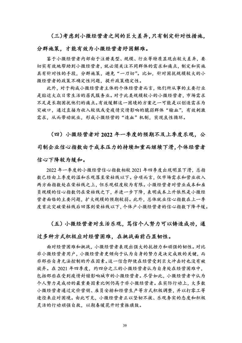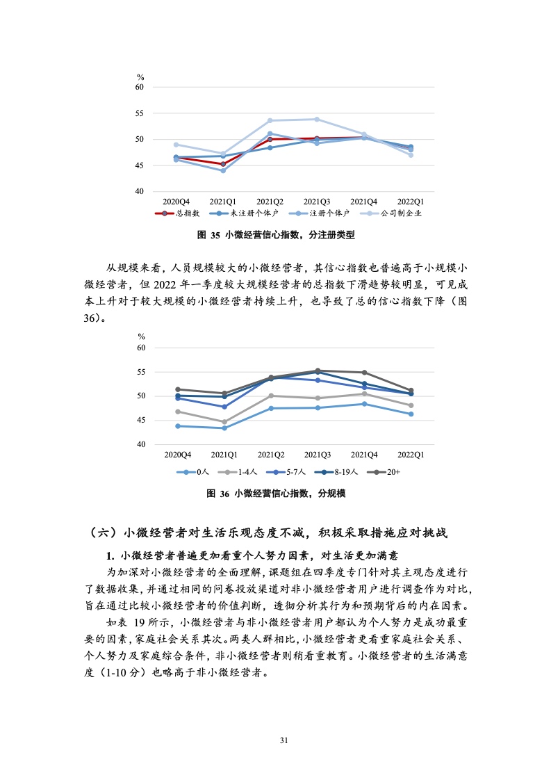 小微经营者对2022年一季度的经营信心总指数下滑至荣枯线以下,公司制企业信心下降明显,个体户信心平缓下滑。 在市场需求和营业收入方面,小微经营信心指数仍保持在轻度乐观区间;雇员规模、运营成本两项的信心在悲观区间内未见缓和。公司制企业的信心指数下滑至荣枯线以下,且总体上较个体户信心更低。