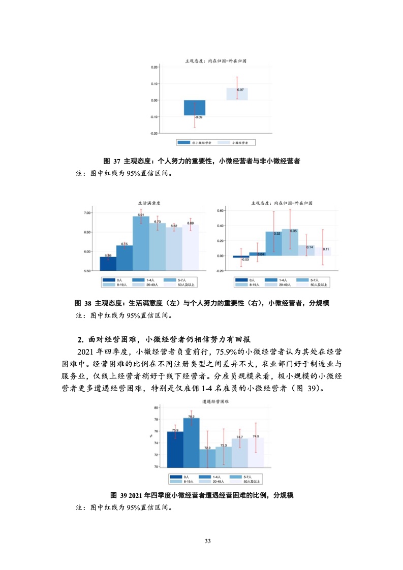小微经营者积极面对经营困难与疫情,对经营保持韧性,相信成功更大程度上取决于个人努力,并通过调整定价营销、个人就业、雇工及经营等方式积极应对挑战。 相比非小微经营者,小微经营者普遍对生活满意度更高,且更看重个人努力因素。尽管大量小微经营者认为自身面临经营困境,但他们通过定价营销、雇员安排和经营生产等方式积极应对,并以打零工等途径来实现自救,凸显出强大韧性。