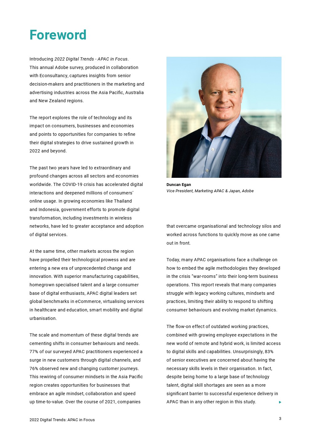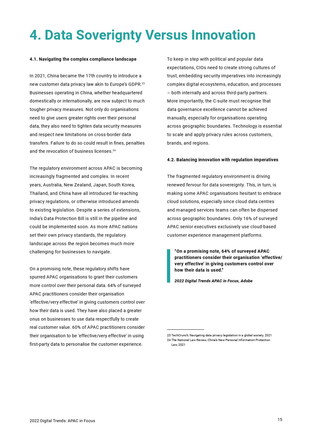 由于相互竞争的组织KPI和传统管理结构,对亚洲企业创造力和创新至关重要的日常协作受到限制。已经进行数字转型的澳大利亚和新西兰企业在系统集成方面也遇到了绊脚石,这使得营销科技合理化成为2022年运营优先事项。与此同时,该地区围绕客户数据隐私的监管环境变得极为复杂,促使亚洲和印度企业在技术基础设施决策中将数据主权置于创新之上。为了跟上不断变化的亚太地区客户,企业必须通过现代化工作实践和技术基础设施、适应混合工作世界,并谨慎平衡创新和监管要求来获得敏捷性。