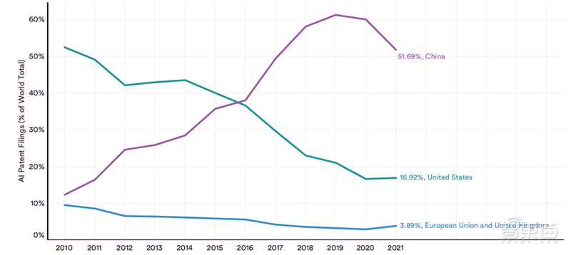 ▲2010-21 年按地理区域划分的⼈⼯智能专利申请(占世界总数的百分⽐)