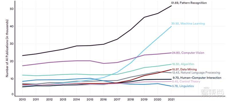 其中,2021年这些出版物的51.5% 是期刊⽂章,21.5% 是会议论⽂,17.0% 来自存储库。细分领域方面,自2015 年以来,模式识别和机器学习方⾯的出版物增加了⼀倍多。其他受深度学习影响较⼤的领域,如计算机视觉、数据挖掘和自然语言处理,增幅较小。