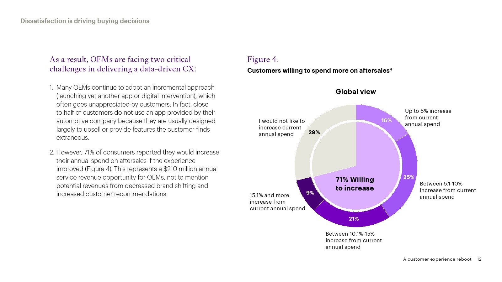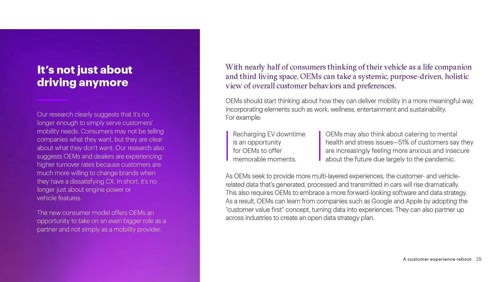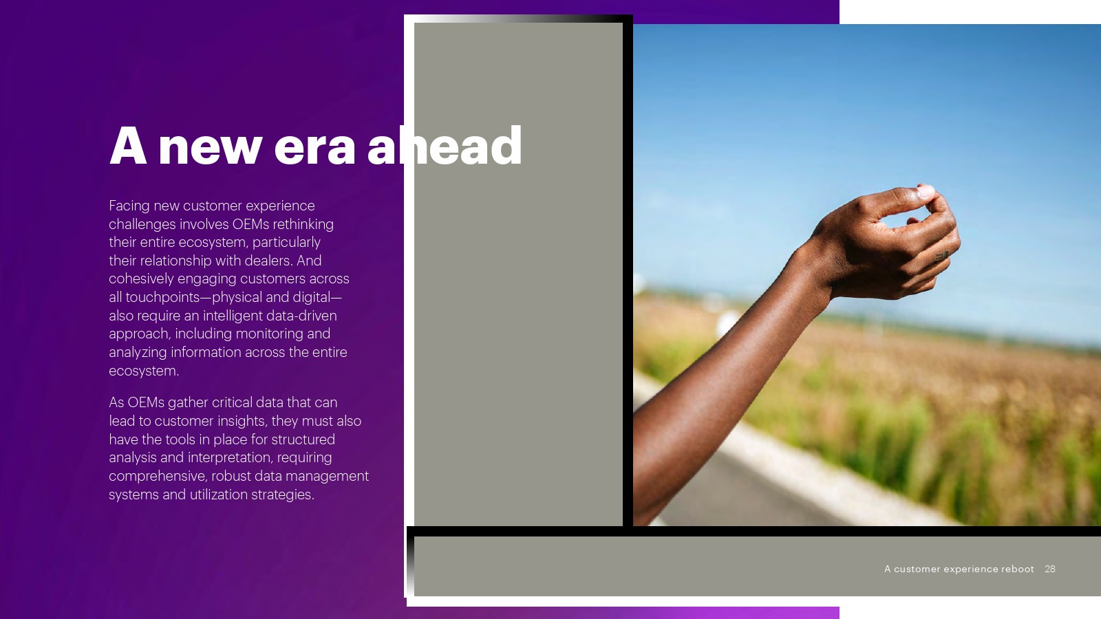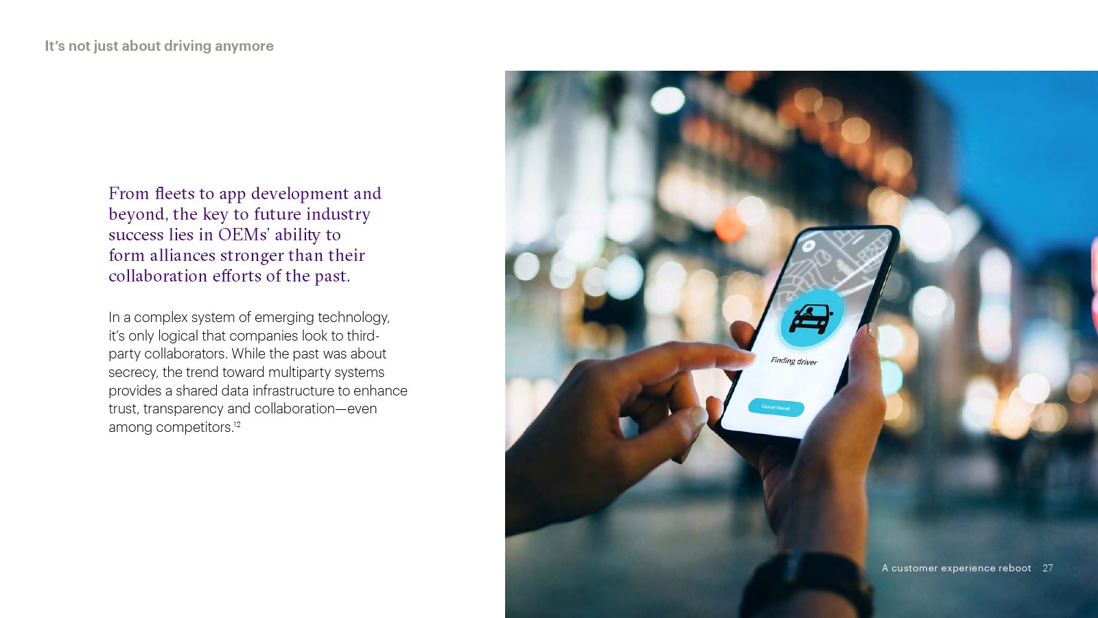 汽车制造商通常提供分散的品牌体验,消费者的参与度和满意度也较低,尤其是在购买后的阶段。汽车制造商面临的挑战是为消费者提供与其他行业相同的轻松和个性化体验。这一点尤为重要,因为47%的客户在未能获得相关客户体验后会更换汽车品牌。