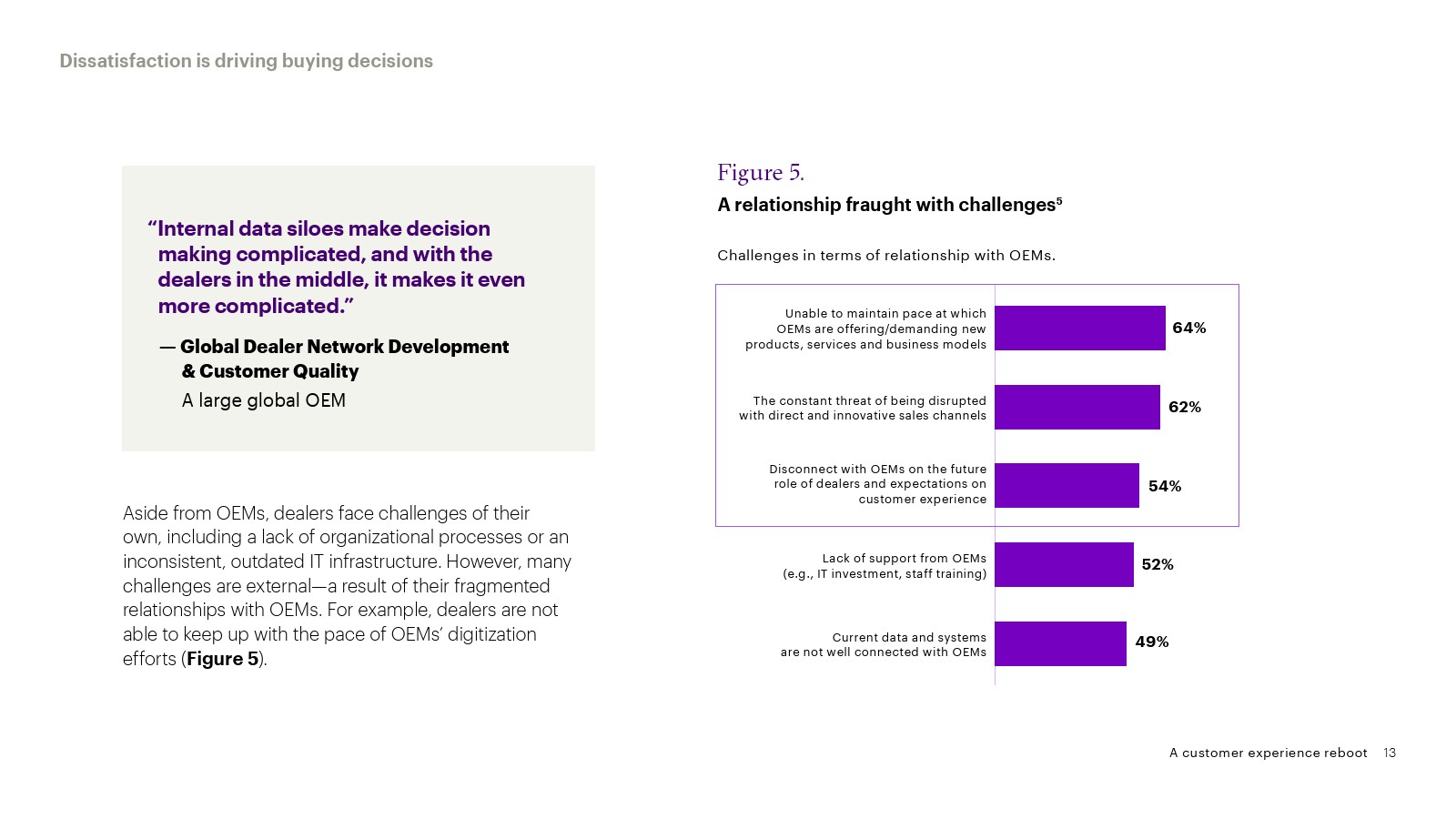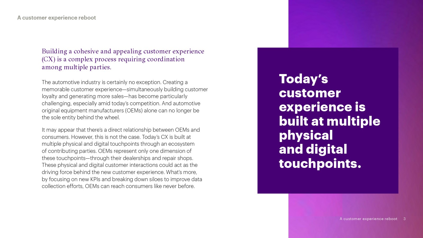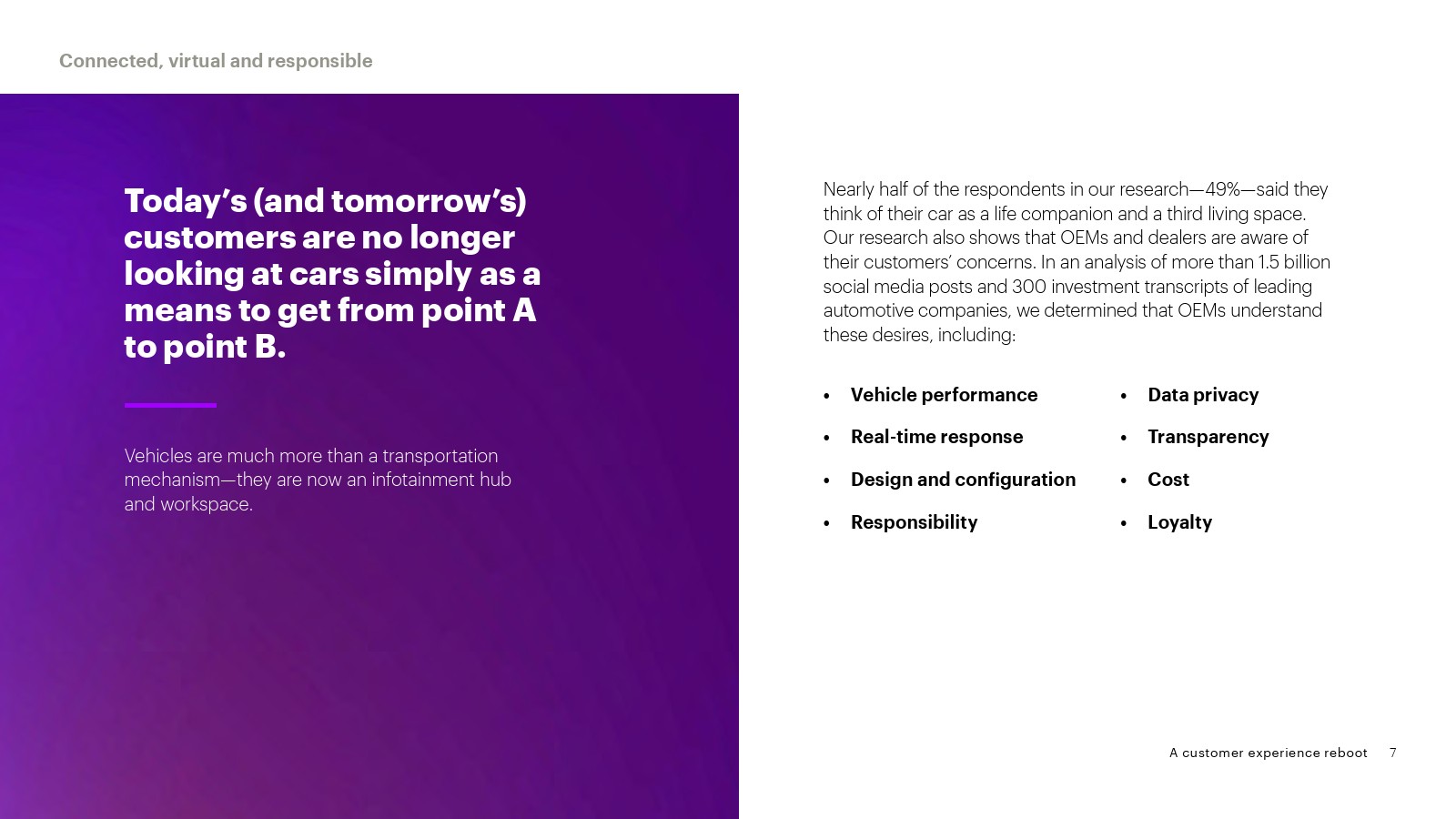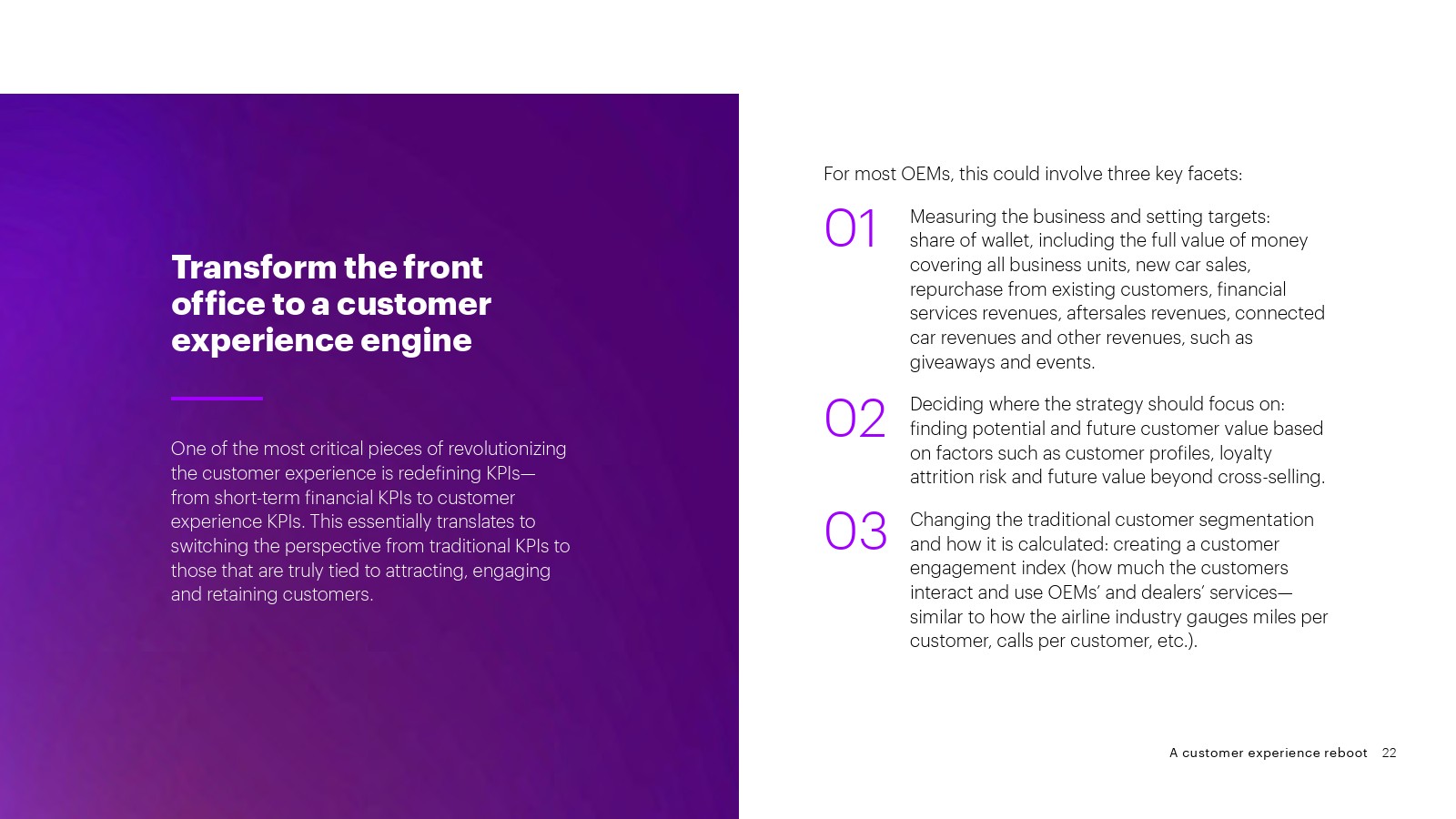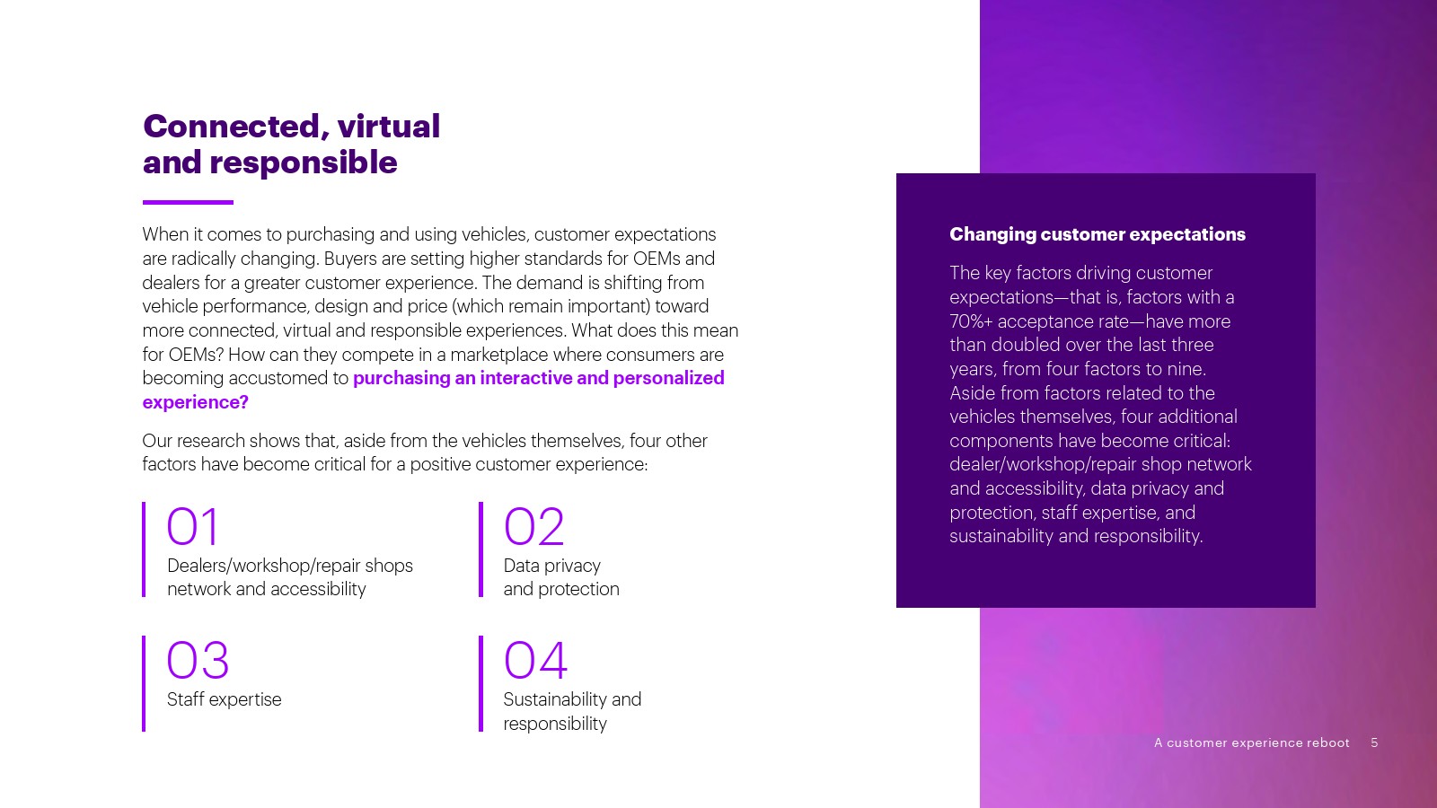 汽车制造商通常提供分散的品牌体验,消费者的参与度和满意度也较低,尤其是在购买后的阶段。汽车制造商面临的挑战是为消费者提供与其他行业相同的轻松和个性化体验。这一点尤为重要,因为47%的客户在未能获得相关客户体验后会更换汽车品牌。