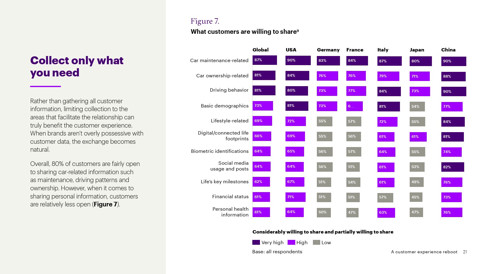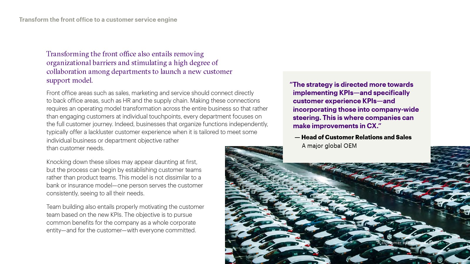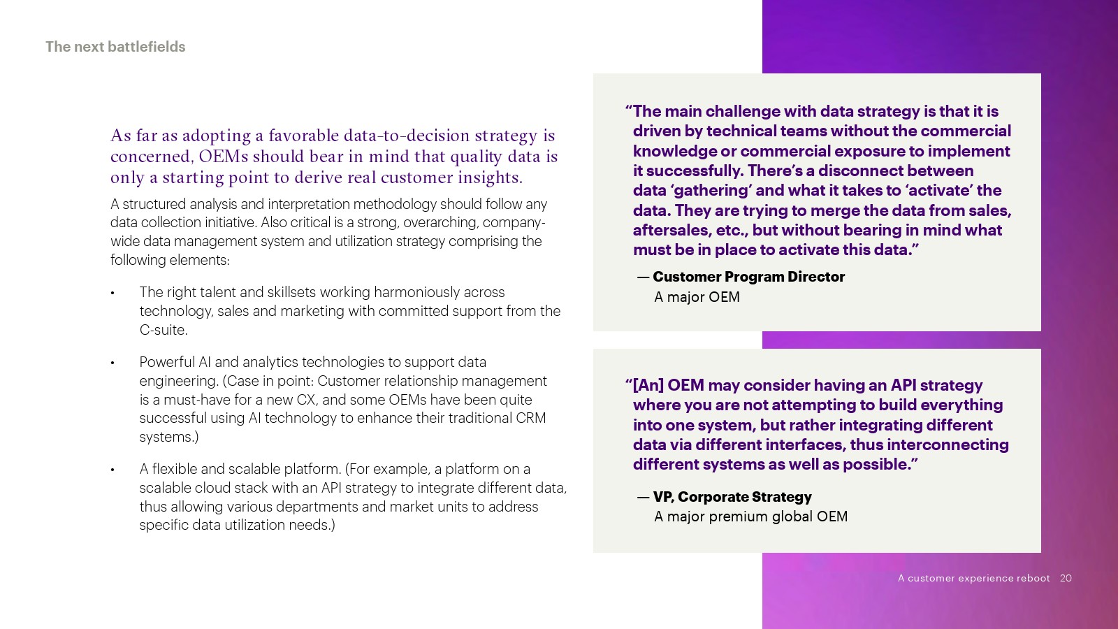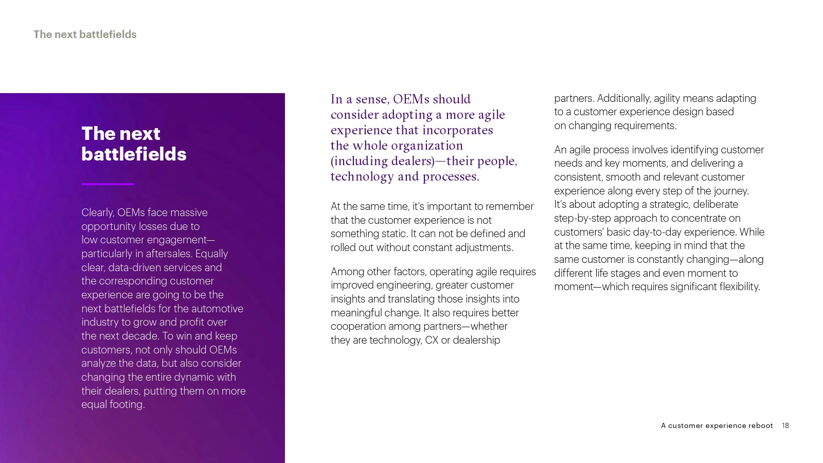 汽车制造商通常提供分散的品牌体验,消费者的参与度和满意度也较低,尤其是在购买后的阶段。汽车制造商面临的挑战是为消费者提供与其他行业相同的轻松和个性化体验。这一点尤为重要,因为47%的客户在未能获得相关客户体验后会更换汽车品牌。