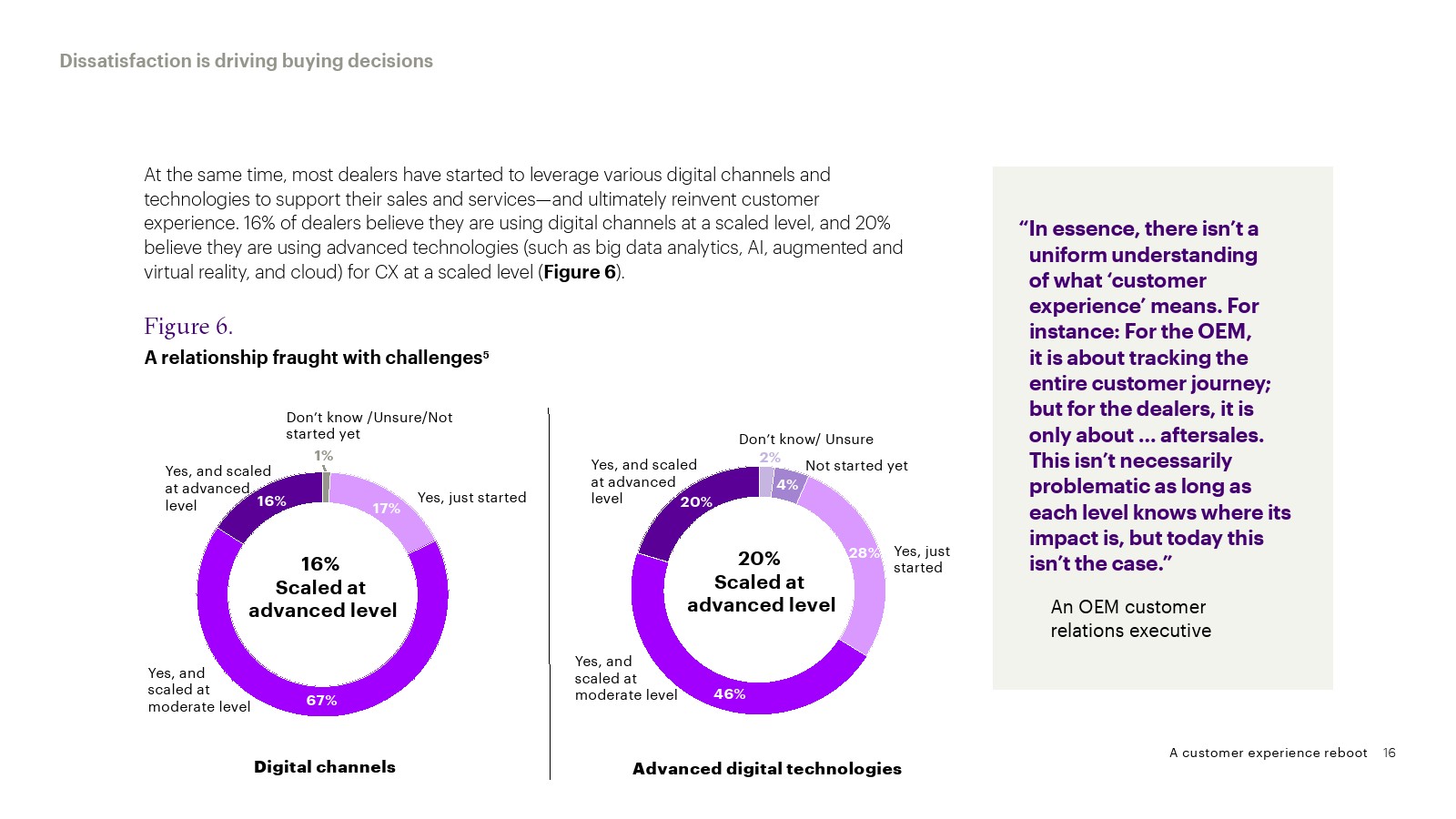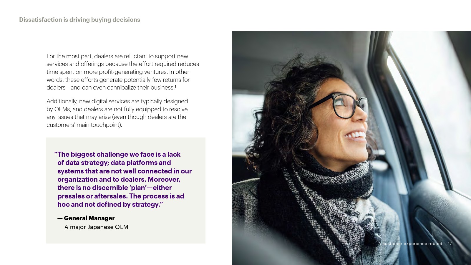 除了车辆本身之外,驾驶员现在还考虑其他几个对积极的客户体验至关重要的因素,包括:经销商/车间/维修店网络的覆盖范围;员工专业知识;数据隐私和保护;以及可持续性和责任感。消费者的担忧与维修和维护的脱节使该行业的销售模式面临风险。