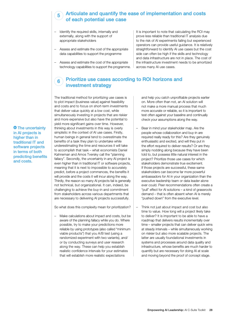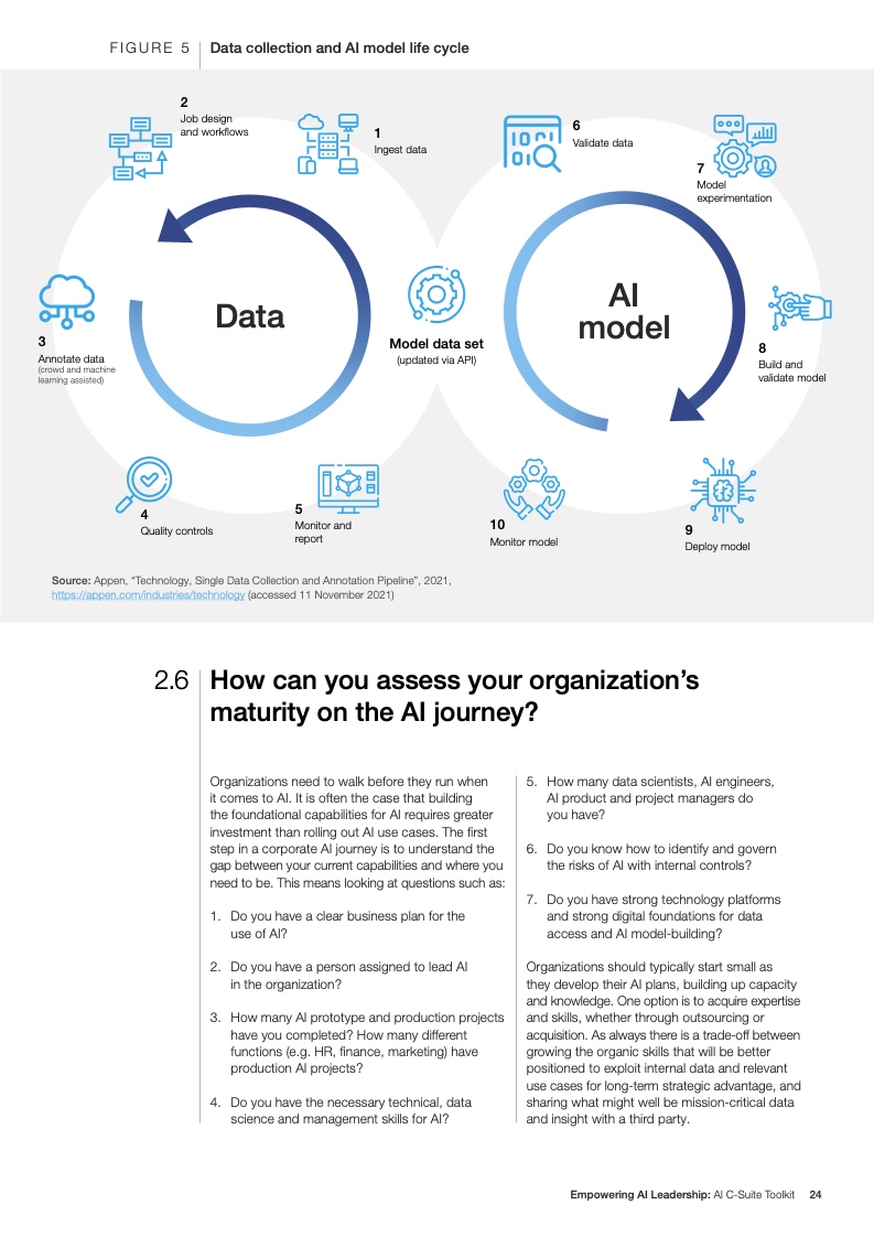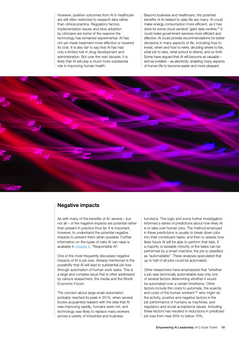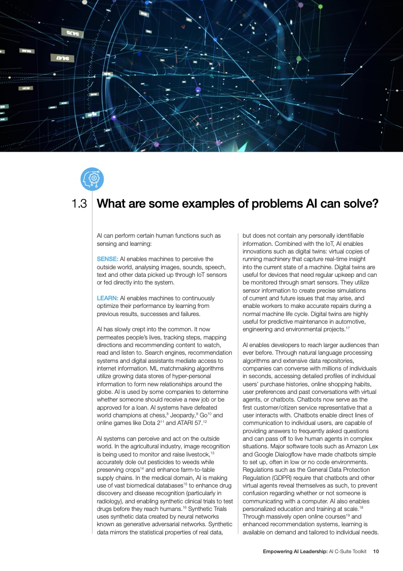 以世界经济论坛之前的工作为基础,指导董事会如何应对AI,报告提供了一套实用的工具,可以帮助企业高管了解AI对其角色的影响,提出正确的问题,了解关键的权衡取舍,并就AI项目和实施做出明智的决定。虽然论坛的董事会工具包面向监督AI实施的高管,但该工具包针对的是实施该战略的最高层高管。它将为领导者提供涵盖多个主题的 AI 基础知识。