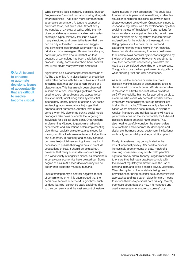 鉴于AI在价值创造、颠覆和破坏方面的潜力,高管们必须更好地理解“可能的艺术,同时管理可能的风险”。这需要多方面的方法和整体理解AI,涵盖技术、组织、监管、社会以及哲学等方面。