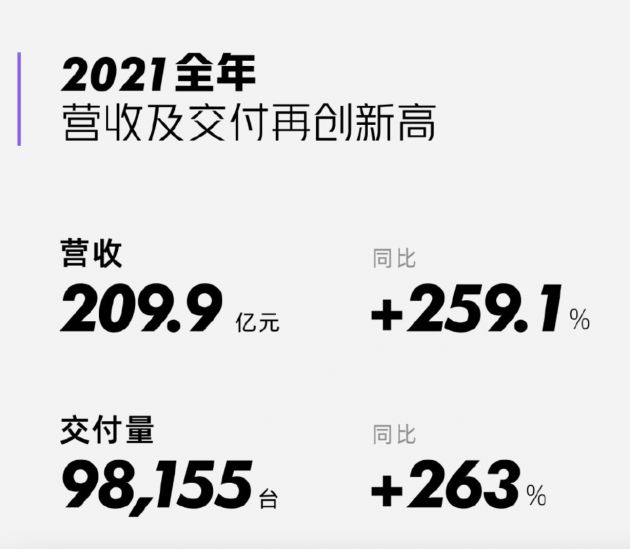 财报显示,2021年汽车总交付量为98155辆,较2020年的27041辆增长263%。