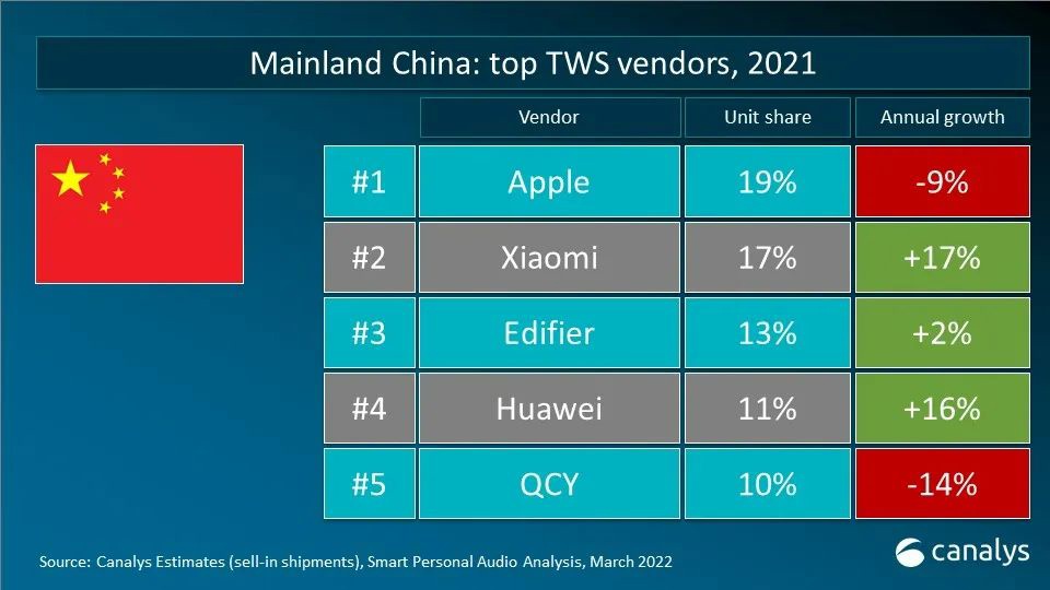 小米(01810)则以超过2300万部TWS的出货保持在第三的位置,同比增长3%。Skullcandy同比增长104%,QCY同比下降13%,分别排名第四和第五。