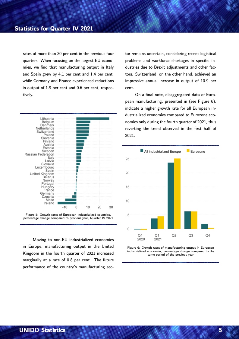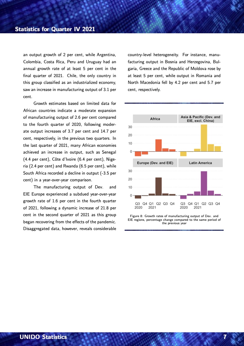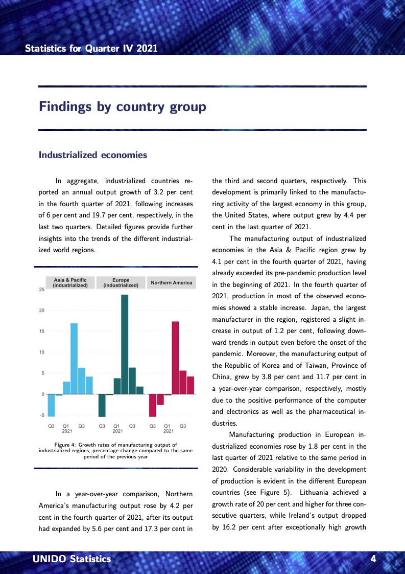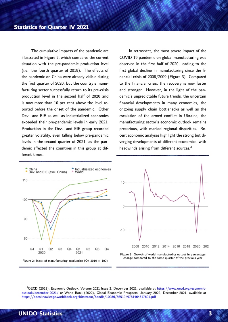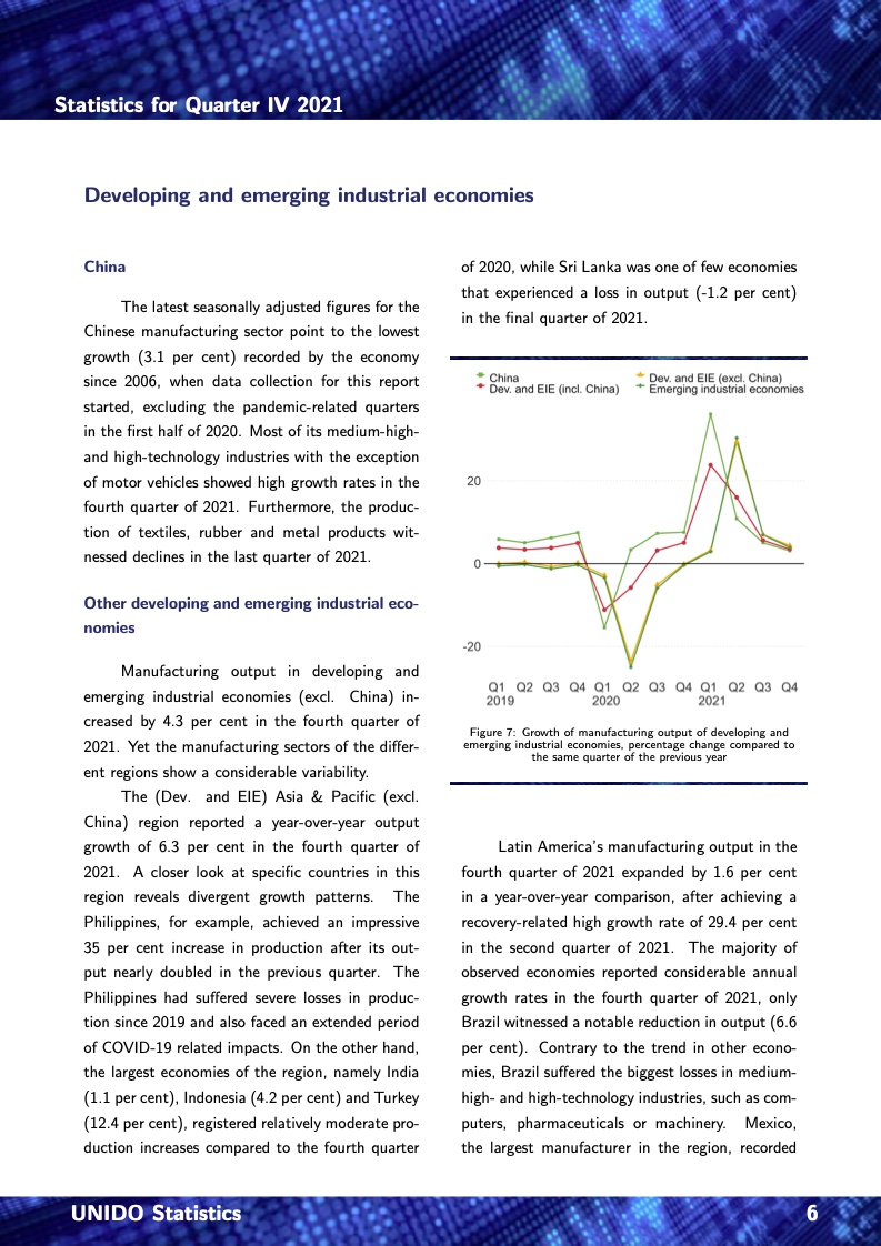 5. 2021年第四季度的报告清晰地展示了全球总体以及不同经济体的制造业产出自2017年以来的变化。可以看出2020年全球制造业生产的严重下降(-4.2%)和2021年的强劲复苏(9.4%)。中国的制造业在2021年取得12.3%的增长率,而在2020年则勉强保持正增长,增长率为0.9%。相比之下,在疫情之前,中国的年增长率至少为6%。