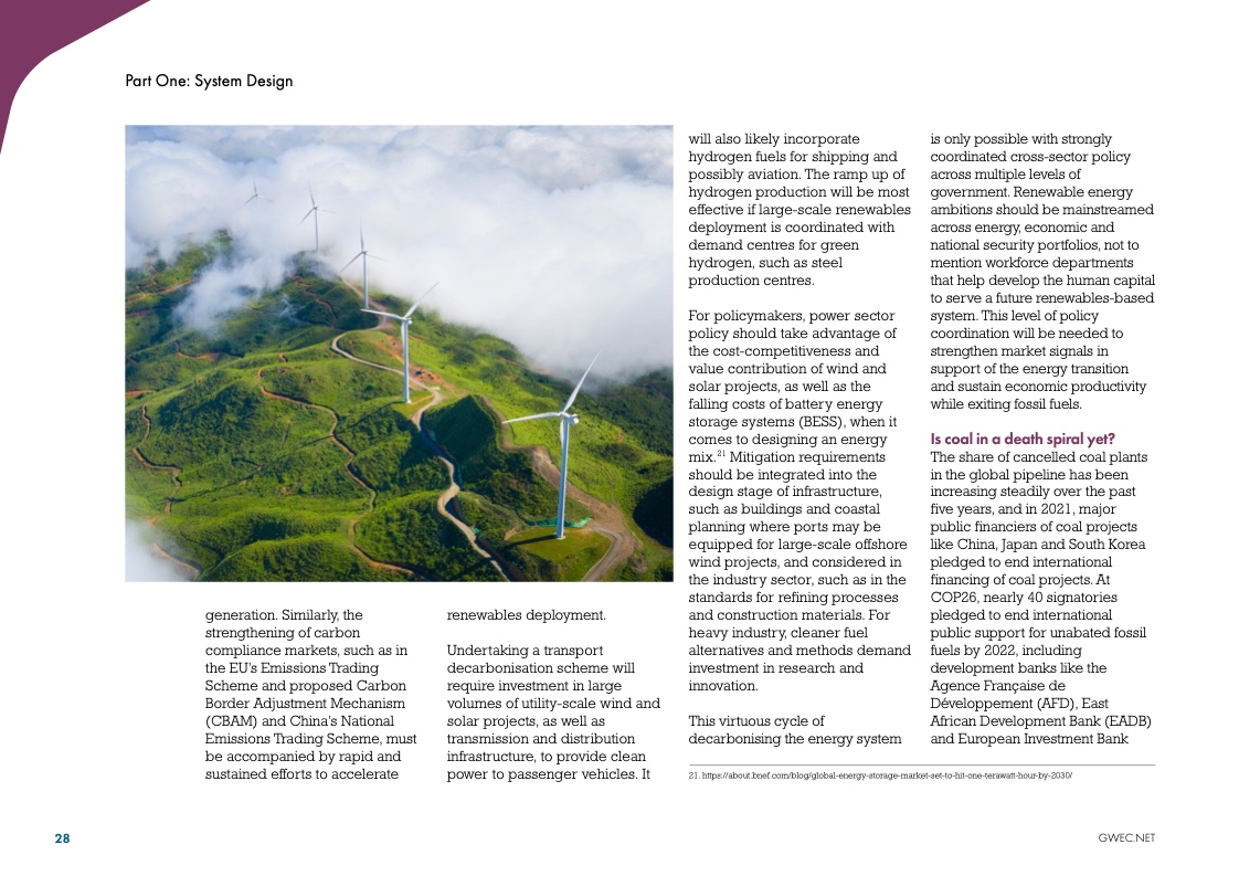2021年风电装机为历史第二高,但仍需要政策突破才能实现零碳目标。多个地区及海上风电的创历史新高反映了市场的强劲增长,但若想保证全球净零排放的如期实现,到这个十年末(2030年),风电年装机量必须翻两番。