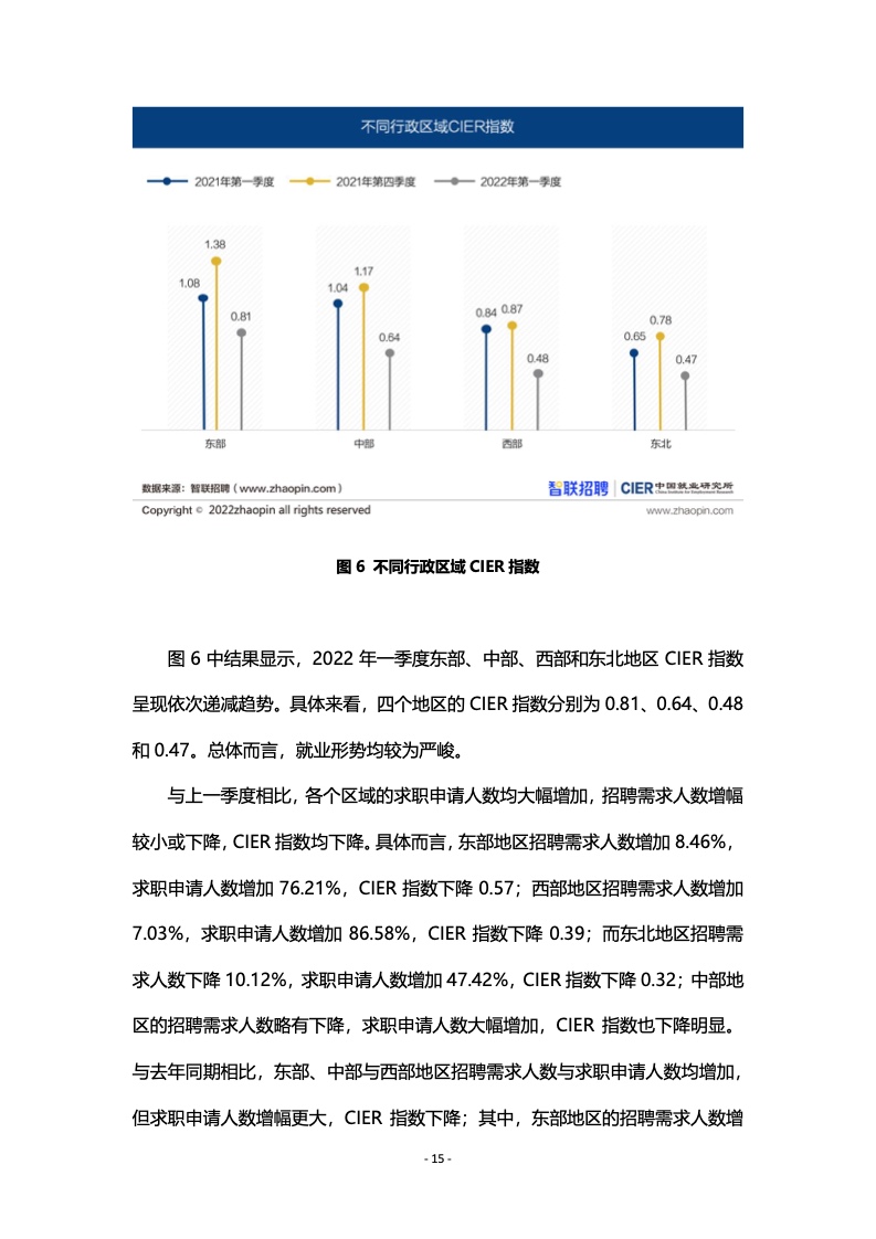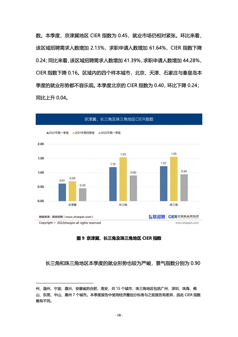 其中,一线城市的CIER指数为0.66,就业竞争仍最为激烈;包括重庆在内的新一线城市的CIER指数为0.69;二线城市的CIER指数为0.72;三线等城市的CIER指数为0.69。