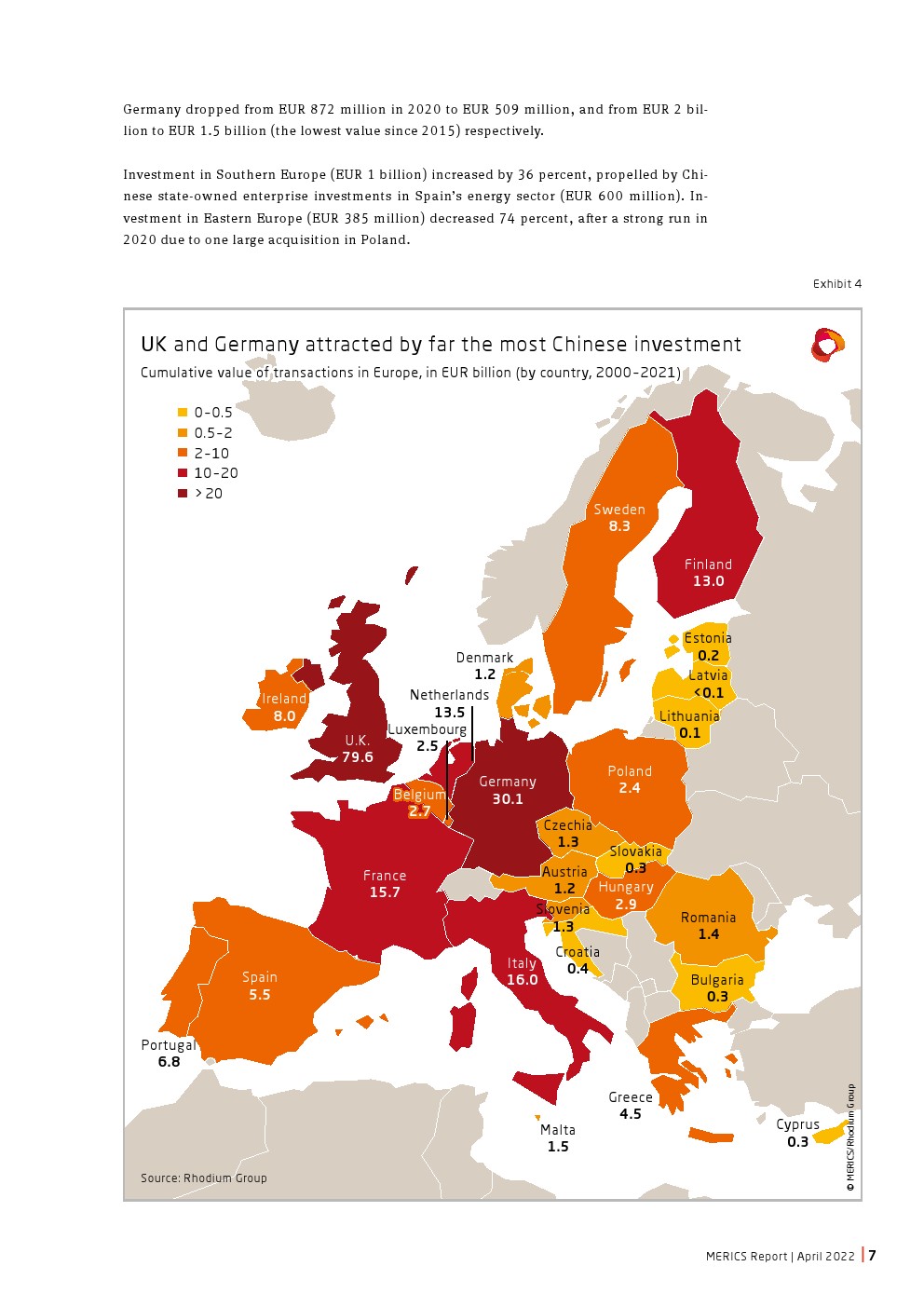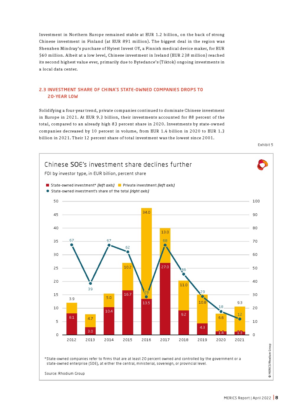 中国国有投资者在欧洲的份额跌至20年来的最低点。与2020年相比,国有企业投资下降10%。它们在中国总投资中所占的份额也达到了20年来的最低点,为12%。国有企业投资集中在能源和基础设施行业,尤其是在南欧。