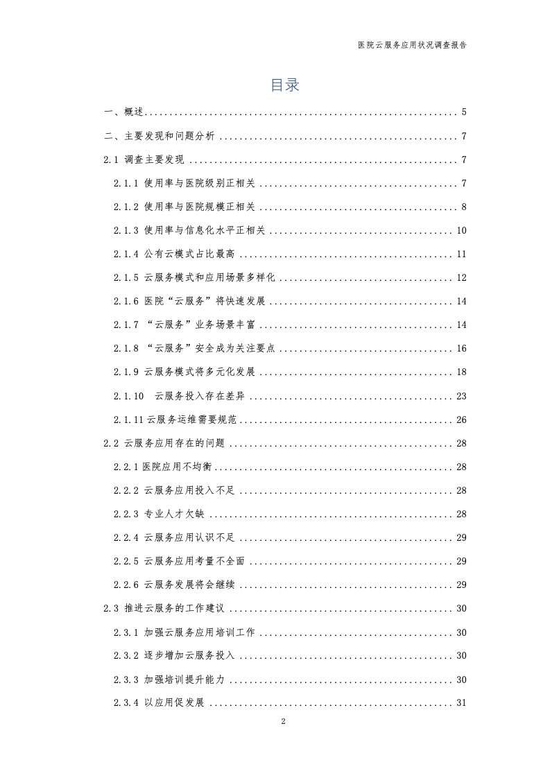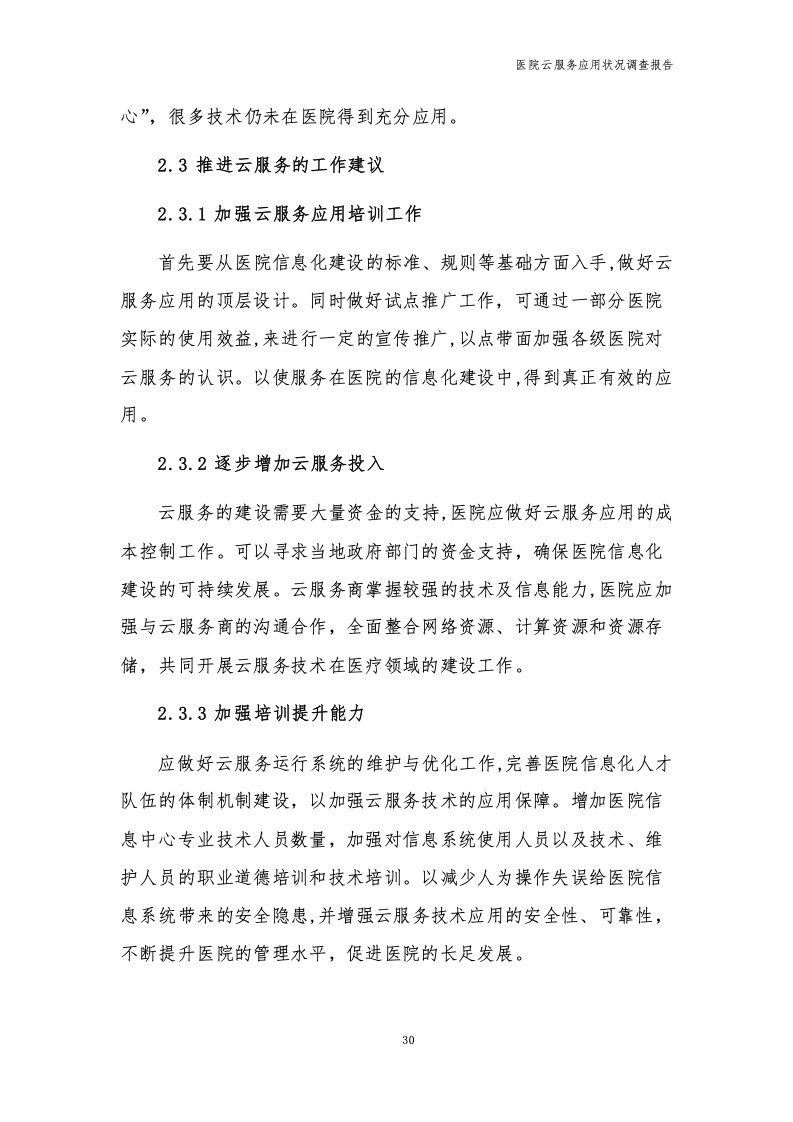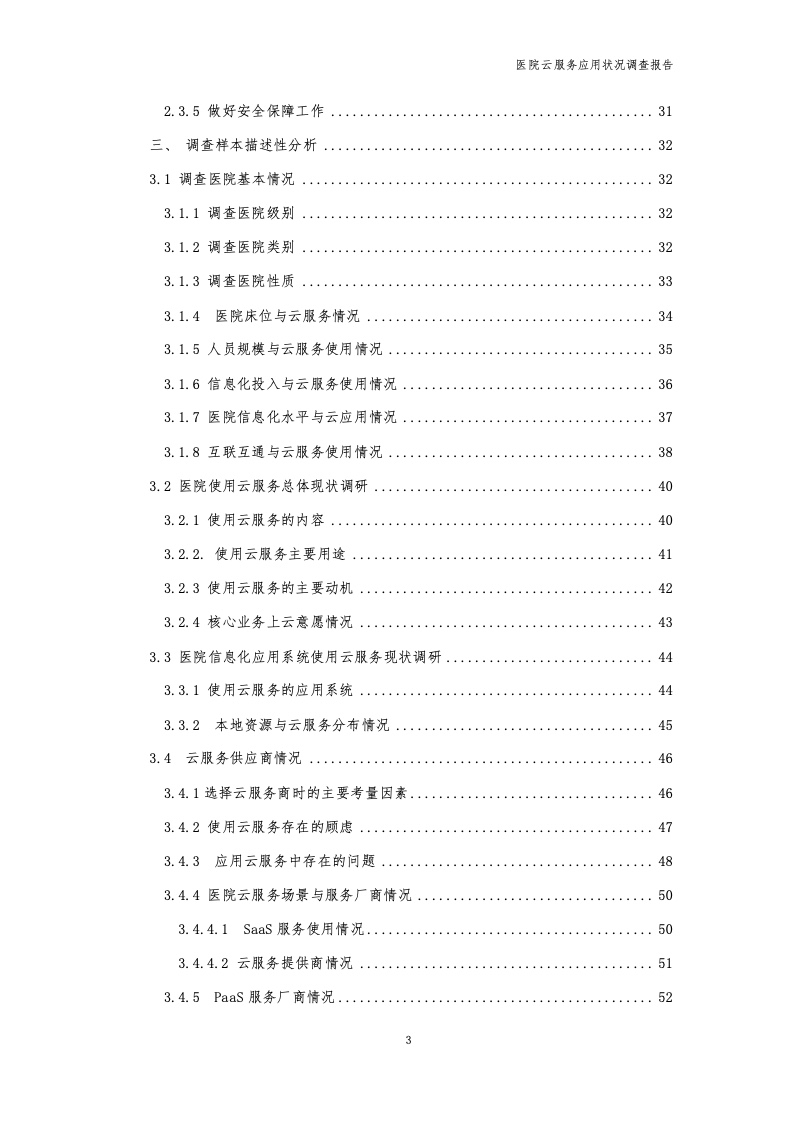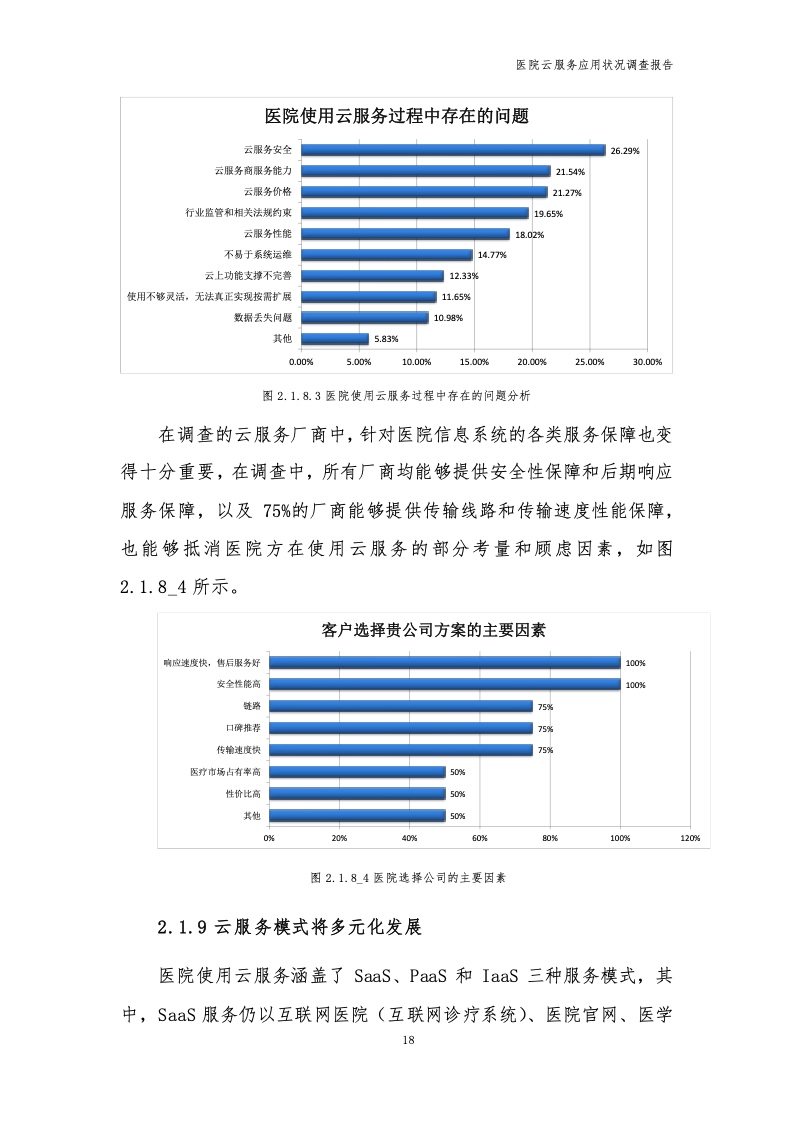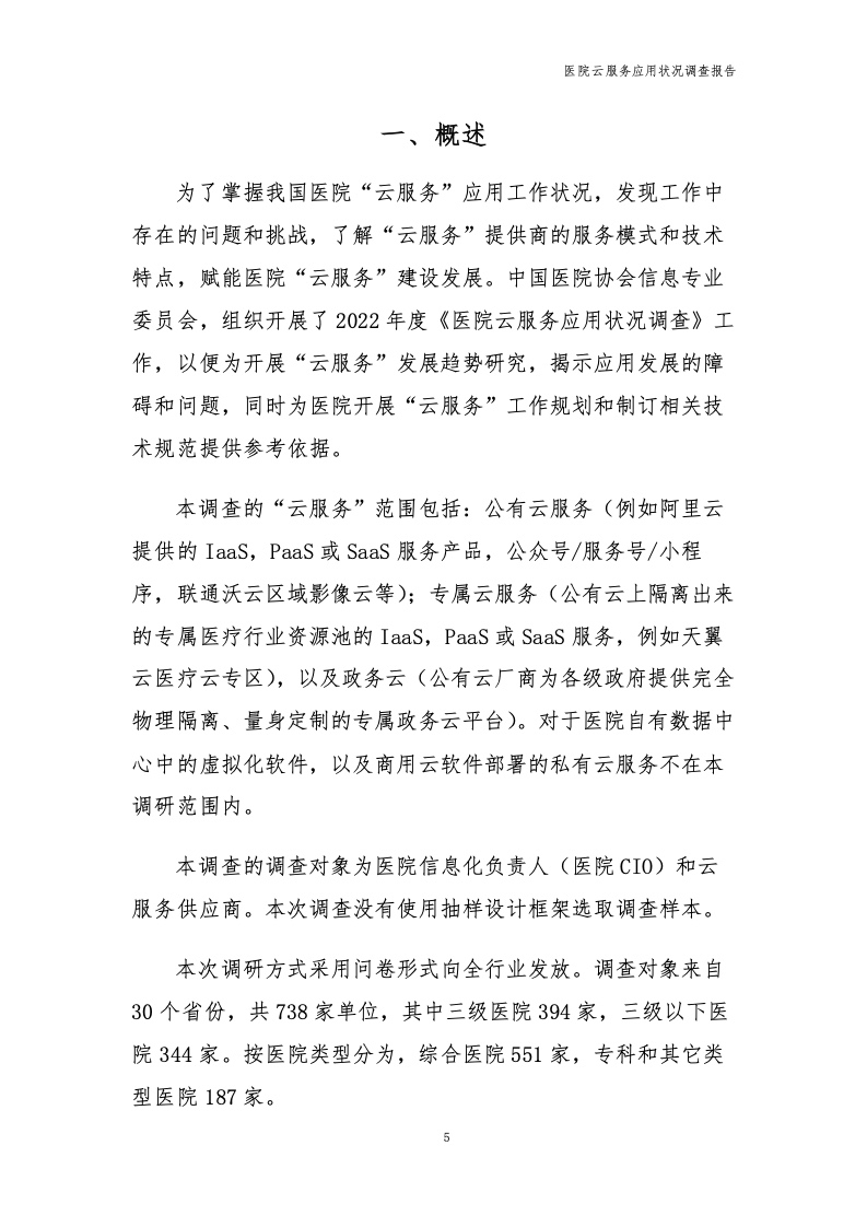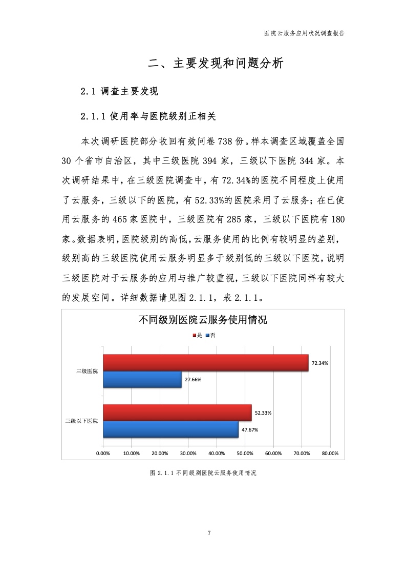 本调查报告分为三部分。一是,主要发现及问题分析部分,包括对医院“云服务”客观应用情况分析,调查对象对“云服务”存在问题和发展趋势的认识和判断。二是,调查样本的描述性分析,为进一步分析提供依据。三是,应用案例部分,分别是在医疗行业应用较多的4家云服务供应商提供的应用案例资料。