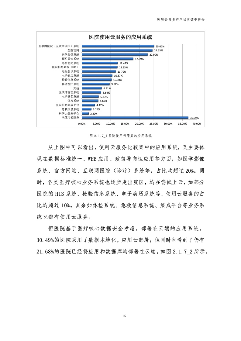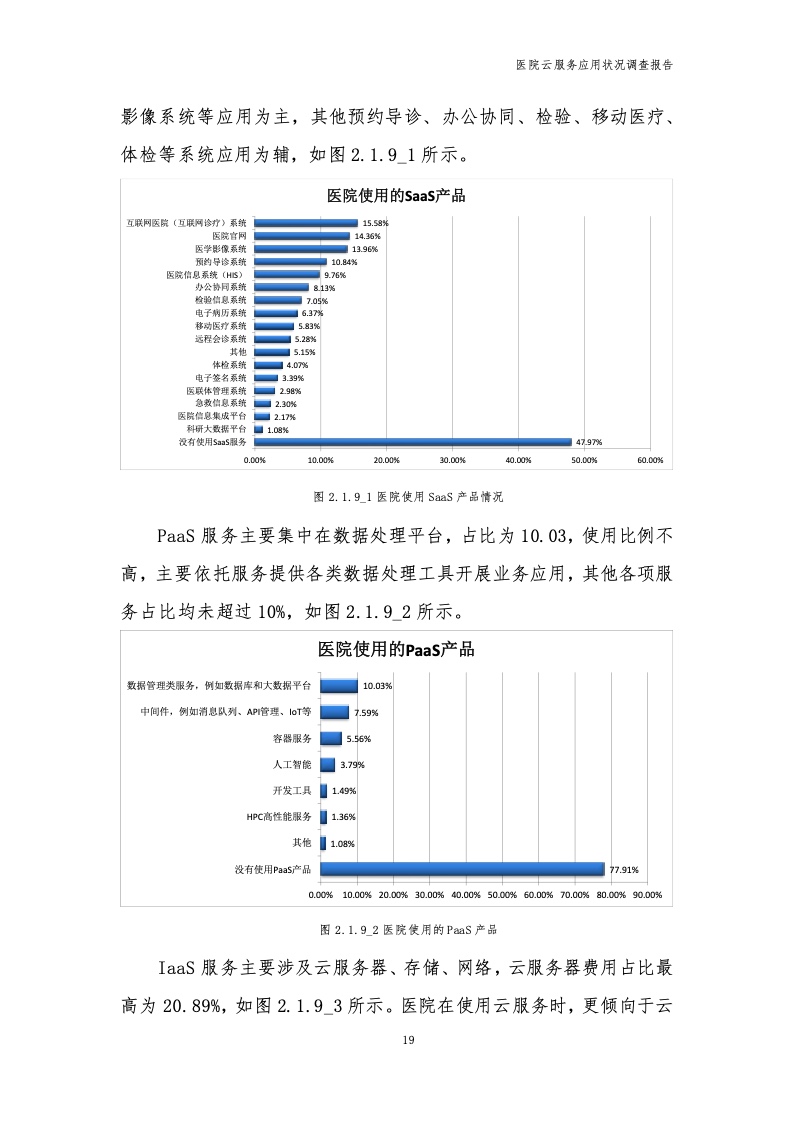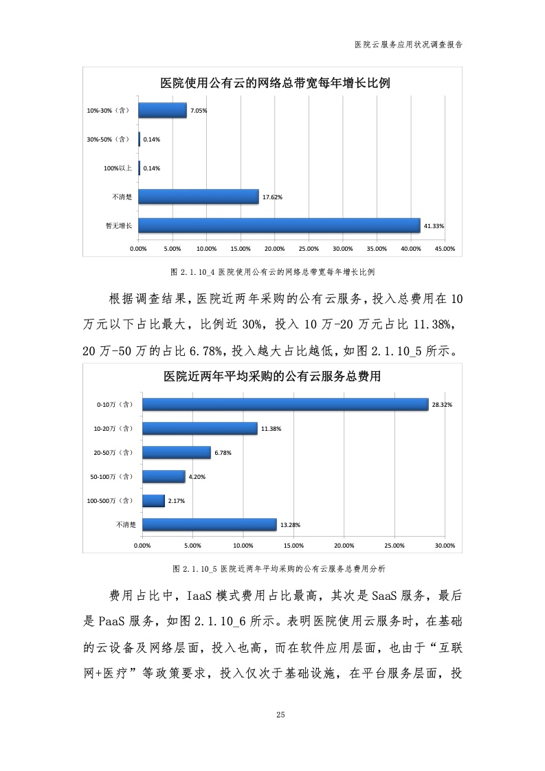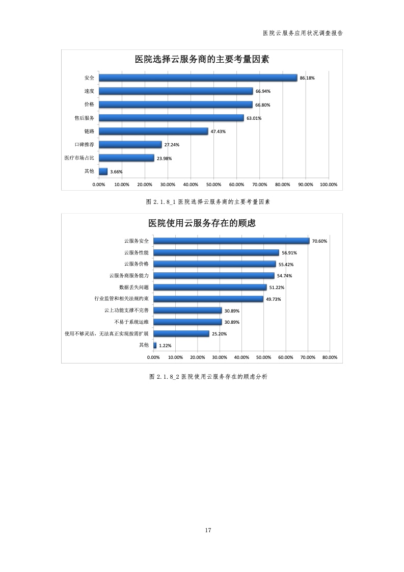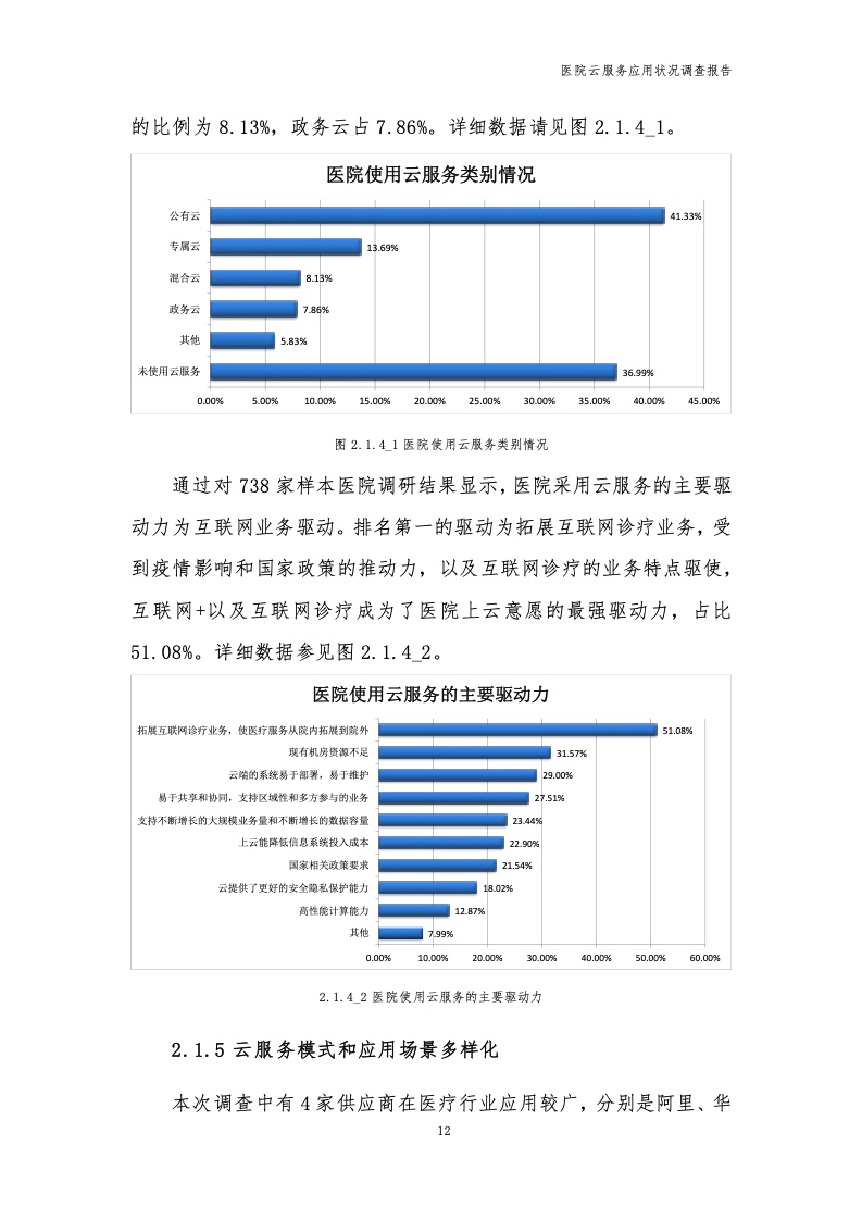 本调查的“云服务”范围包括:公有云服务(例如阿里云提供的IaaS、PaaS或SaaS服务产品,公众号/服务号/小程序、联通沃云区域影像云等);专属云服务(公有云上隔离出来的专属医疗行业资源池的IaaS、PaaS或SaaS服务,例如天翼云医疗云专区),以及政务云(公有云厂商为各级政府提供完全物理隔离、量身定制的专属政务云平台)。对于医院自有数据中心中的虚拟化软件,以及商用云软件部署的私有云服务不在本调研范围内。