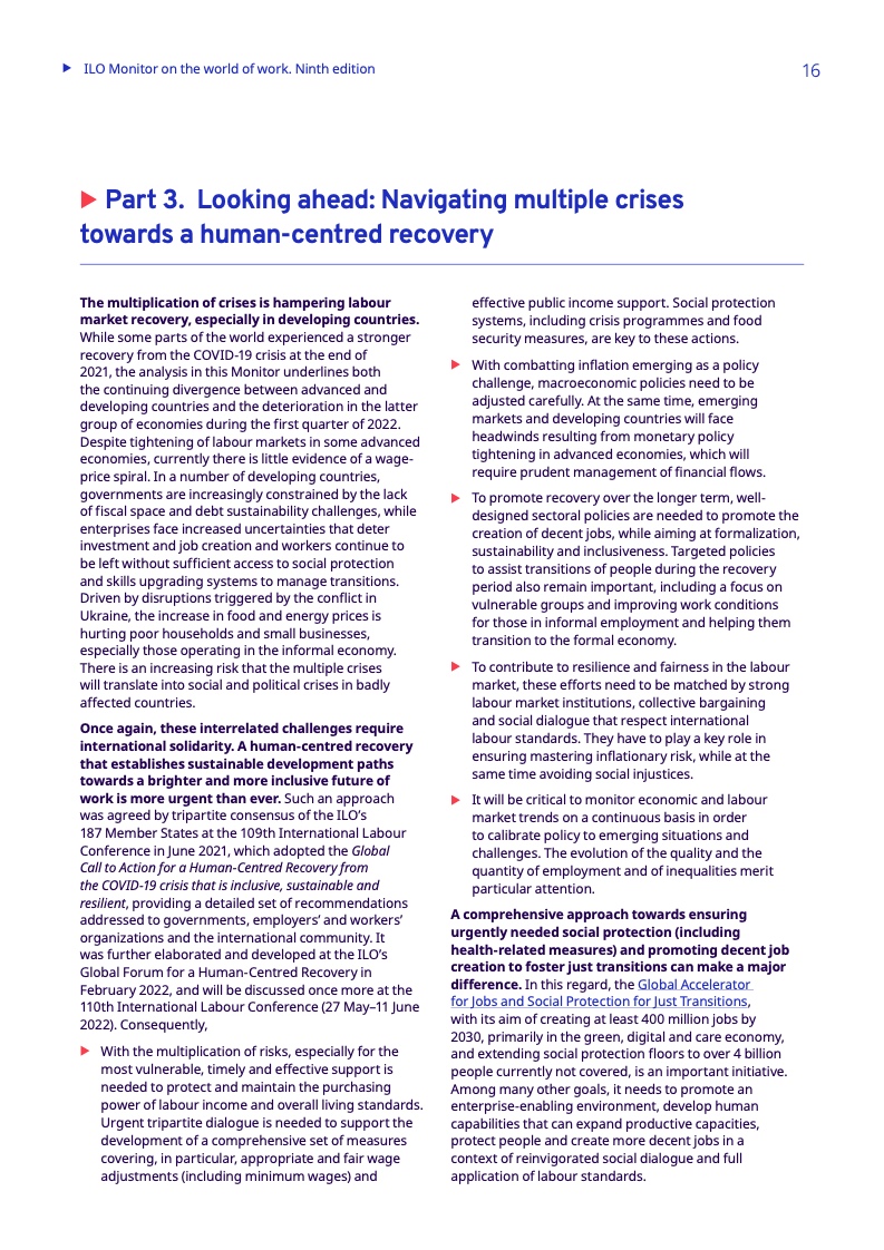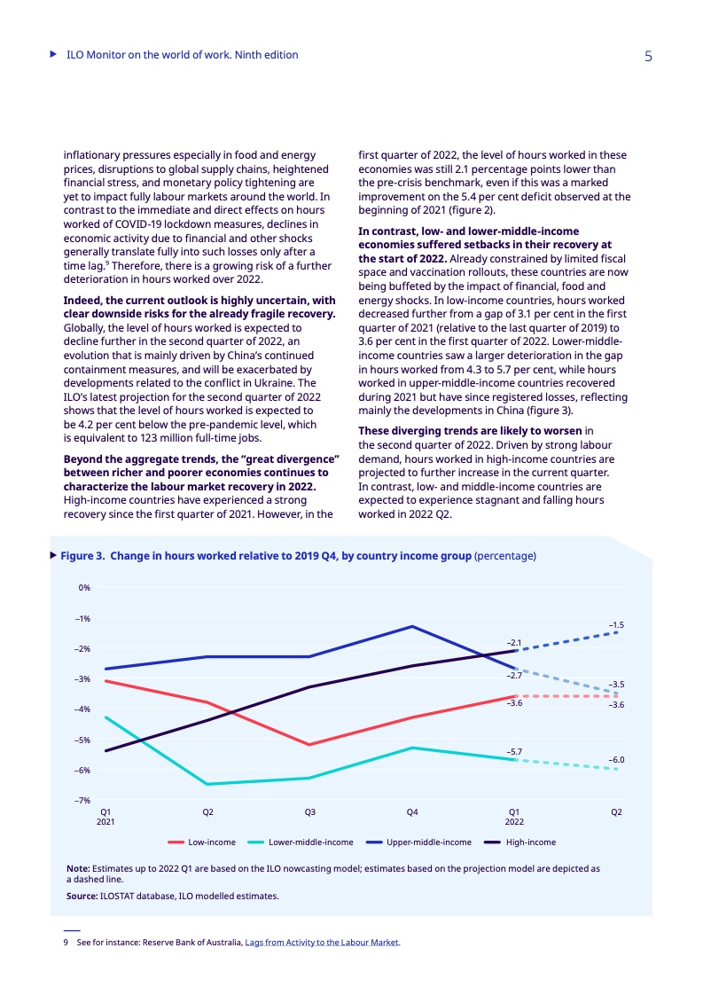 报告指出,受通货膨胀、金融动荡、潜在的债务困扰和全球供应链中断等多重全球危机的影响,2022年工作时间进一步恶化的风险越来越大。在未来几个月内,全球劳动力市场将受到更广泛的影响。