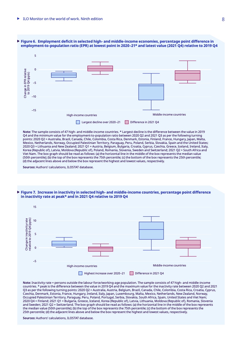 报告还发现,较富裕经济体和较贫穷经济体复苏的差异正在不断拉大。虽然高收入国家的工作时间有所恢复,但低收入和中低收入经济体在今年第一季度遭受挫折,与危机前的基准相比,分别有3.6%和5.7%的差距。这些分化的趋势在2022年的第二季度可能会恶化。