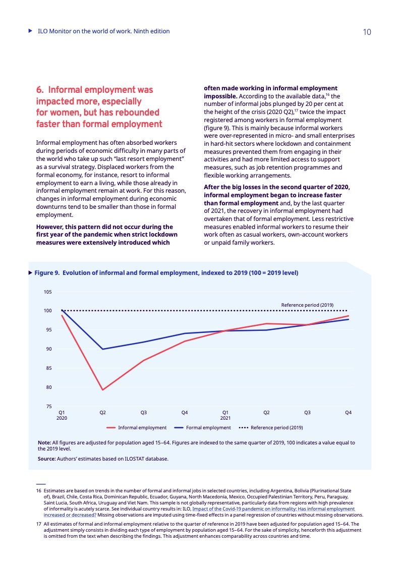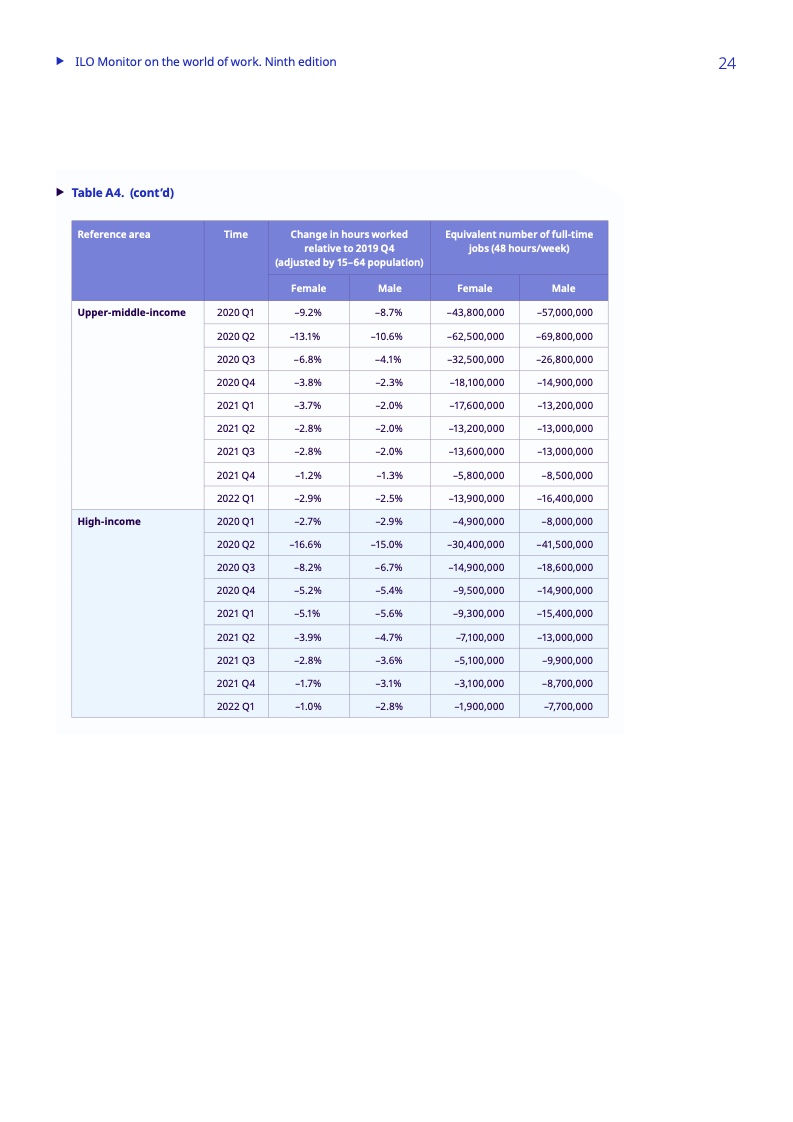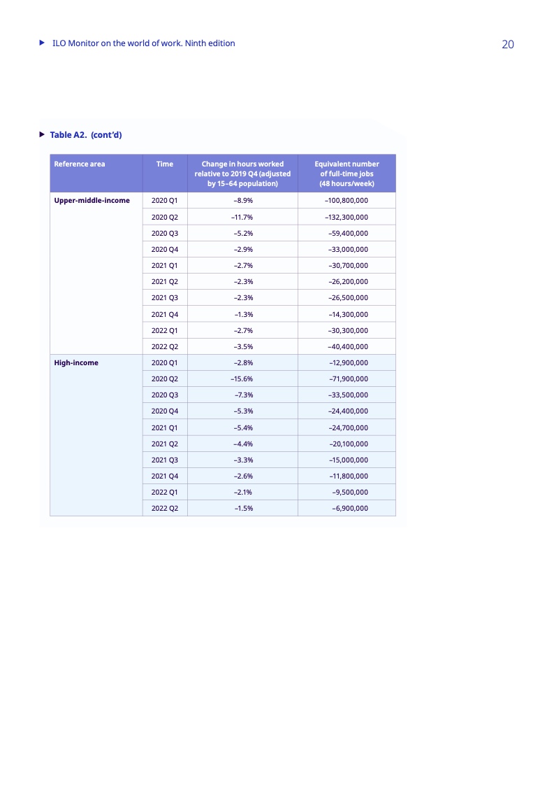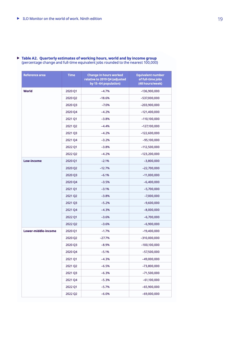劳工组织最新报告显示,在2021年最后一个季度取得重大进展后,2022年第一季度全球工作时间下降,比危机前的基准(2019年第四季度)低3.8%。这相当于有1.12亿个全职工作的赤字。这比劳工组织在2022年1月公布的数字有了明显的下降。