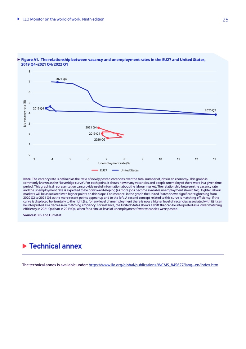 报告指出,在2021年底和2022年初,发达经济体的职位空缺急剧上升,导致劳动力市场收紧,相对于求职者来说,可提供的工作数量越来越多。但总的来说,没有强有力的证据表明劳动力市场普遍过热,因为许多国家有相当多的失业和剩余的劳动力。