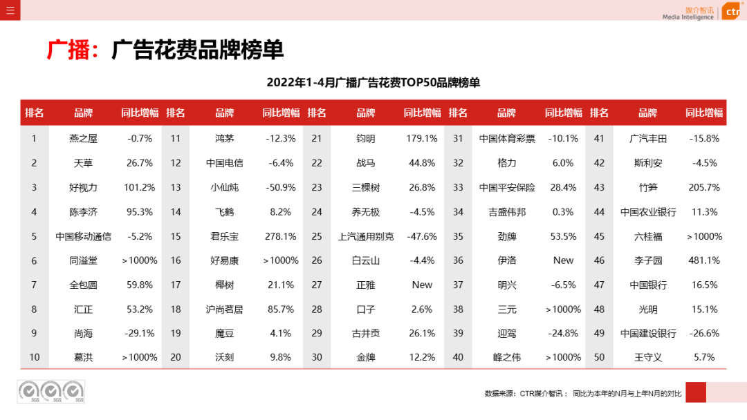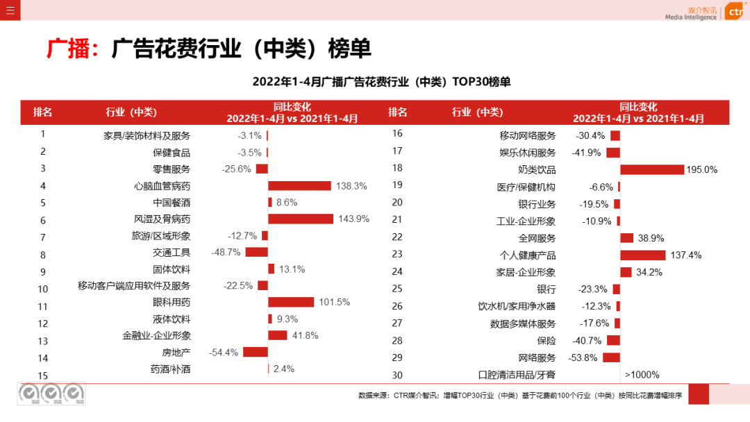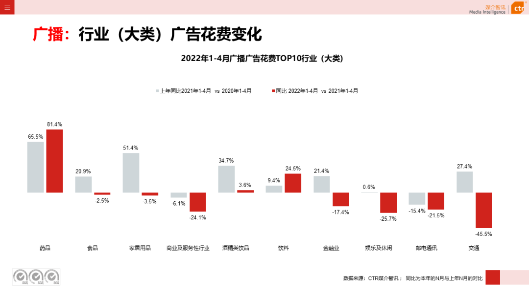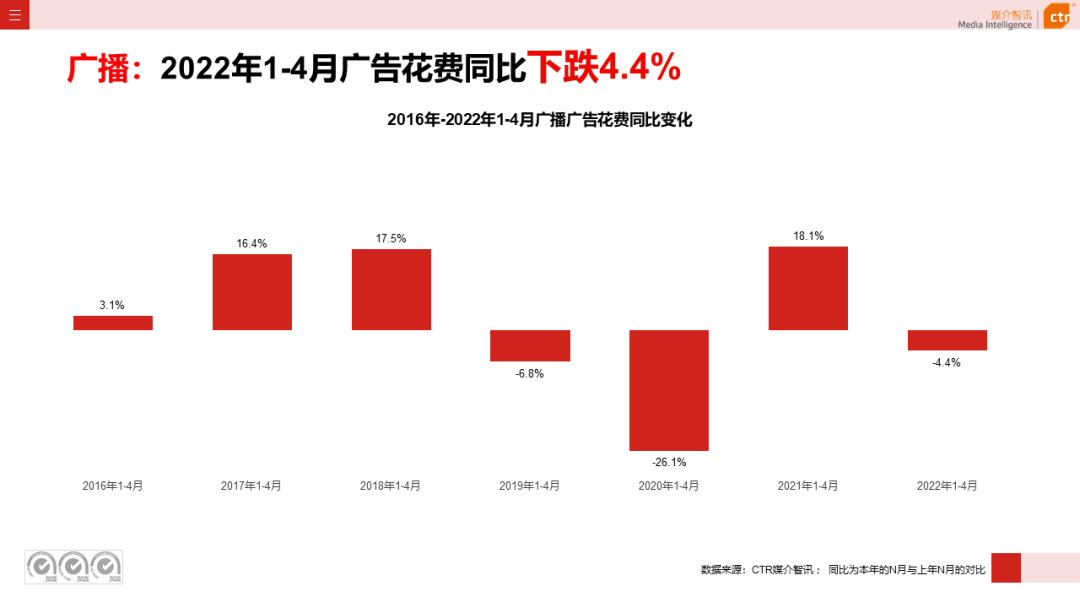 CTR:2022年1-4月广播广告刊例花费同比下跌4.4%
