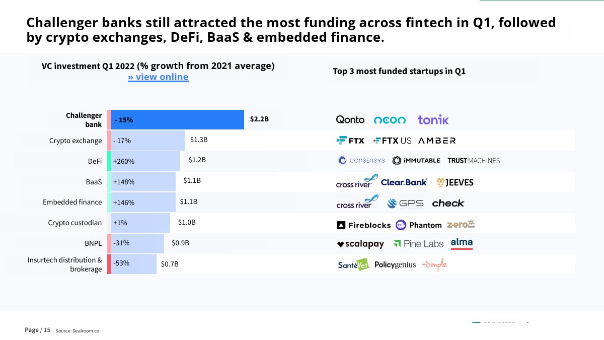 金融科技投资比更广泛的风险投资生态系统更有弹性,尤其是与去年的数字相比。Dealroom最新的金融科技报告分析了全球金融科技投资在2022年第一季度的新趋势和数字。